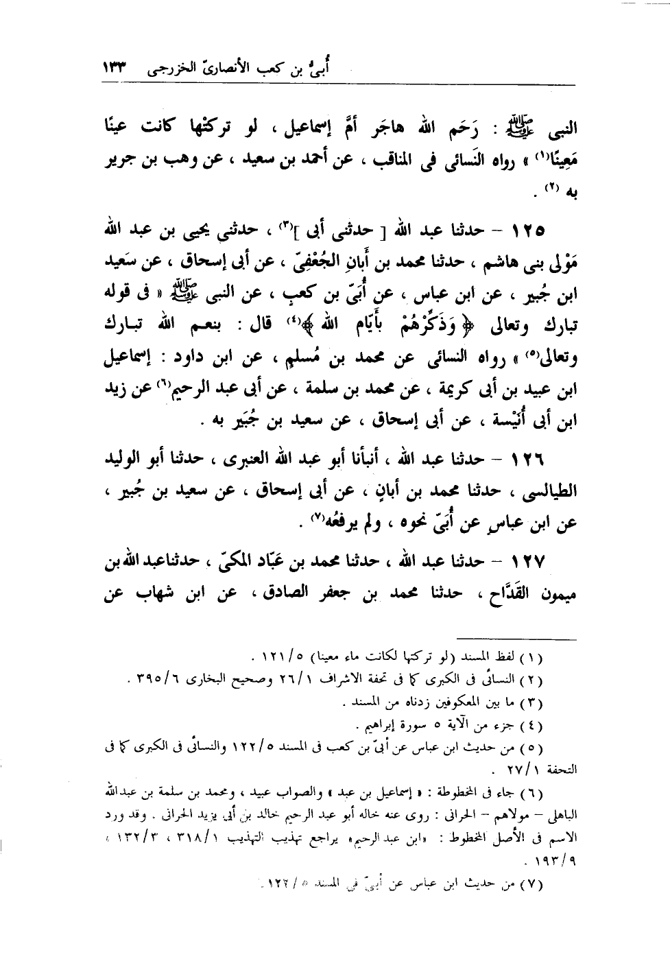 126 - حدثنا عبد الله، أنبأنا أبو عبد الله العنبري، حدثنا أبو الوليد الطيالسي، حدثنا محمد بن أبانٍ، عن أبي إسحاق، عن سعيد بن جُبير، عن ابن عباسٍ عن أُبي نحوه، ولم يرفعُه (¬5) .