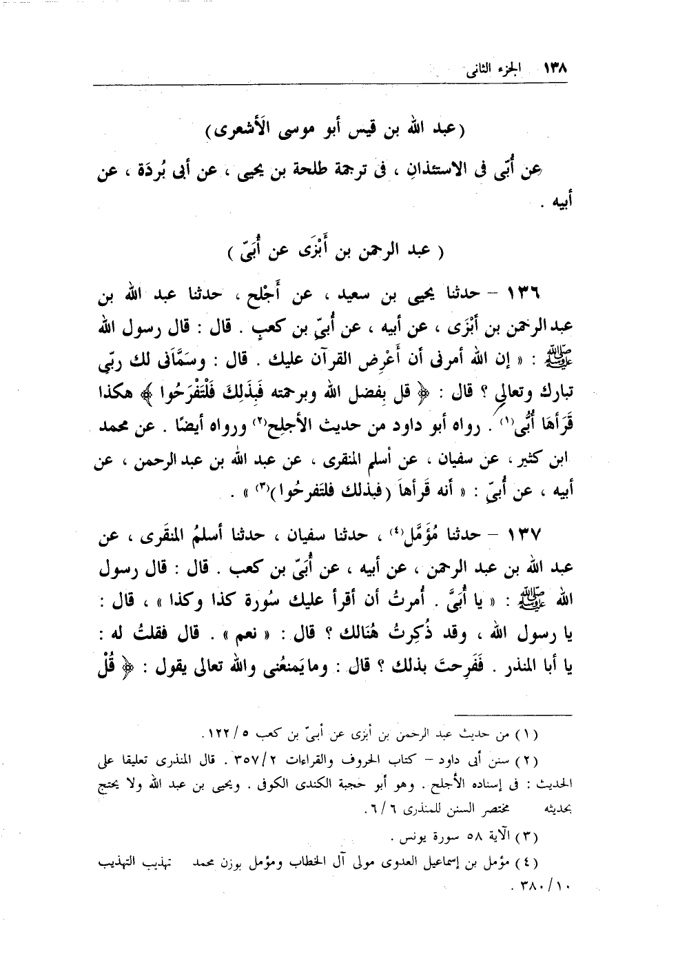136 - حدثنا يحيى بن سعيد، عن أَجْلح، حدثنا عبد الله بن عبد الرحمن ابن أبْزَى، عن أبيه، عن أبي بن كعبٍ. قال: قال رسول الله - صلى الله عليه وسلم -: (إن الله أمرني أن أعْرِض القرآن عليك. قال: وسماني لك ربي تبارك وتعالى؟ قال: {قُلْ بِفَضْلِ اللهِ وَبِرَحْمَتِهِ فَبِذَلِكَ فَلتَفْرَحُوا} هكذا قرأها أُبي (¬1) . رواه أبو داود من حديث الأجلح (¬2) ورواه أيضاً. عن محمد بن كثير، عن سفيان، عن أسلم المنقري، عن عبد الله بن