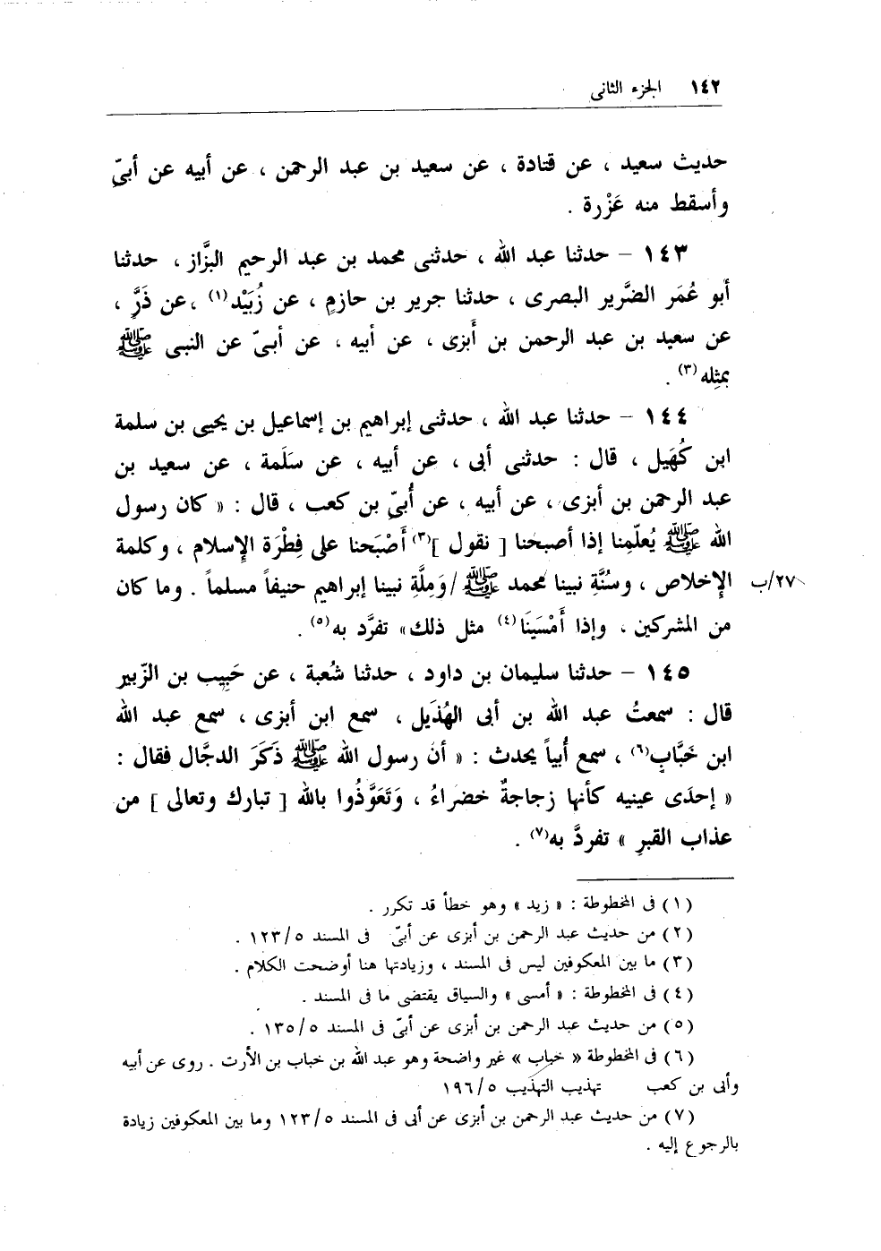 143 - حدثنا عبد الله، حدثني محمد بن عبد الرحيم البزَّاز، حدثنا أبو عُمَر الضرير البصري، حدثنا جرير بن حازمٍ، عن زُبيد (¬1) ، عن ذر، عن سعيد بن عبد الرحمن بن أبزى، عن أبيه، عن أبيّ عن النبي - صلى الله عليه وسلم - بمثله (¬2) .