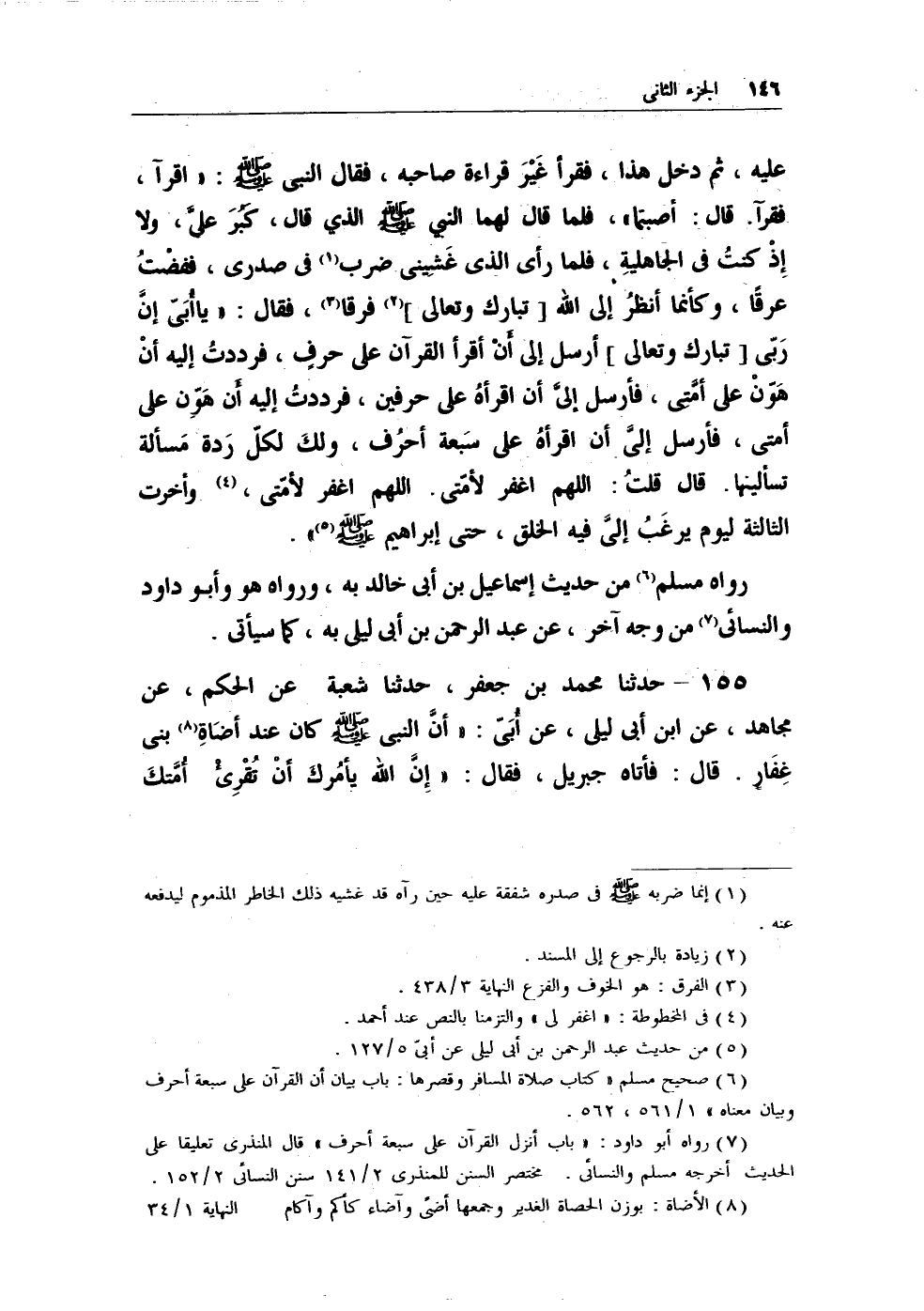 (¬7) رواه أبو داود: (باب أنزل القرآن على سبعة أحرف) قال المنذري تعليقا على الحديث أخرجه مسلم والنسائي. مختصر السنن للمنذري 2/141 سنن النسائي 2/152.