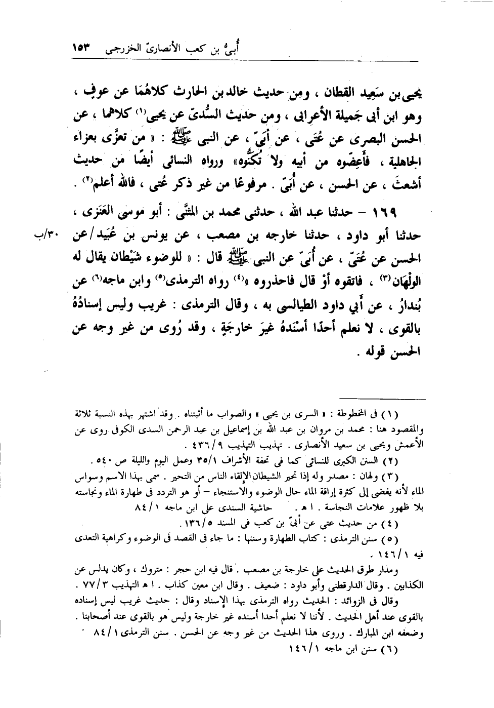 169 - حدثنا عبد الله، حدثني محمد بن المثنى: أبو موسى العنزي، حدثنا أبو داود، حدثنا خارجة بن مصعب، عن يونس بن عُبَيد/ عن الحسن عن عُتَي، عن أُبي عن النبي - صلى الله عليه وسلم - قال: (للوضوء شيطان يقال له الولْهَان (¬1) ، فاتقوه أوْ قال فاحذروه) (¬2) رواه الترمذي (¬3)