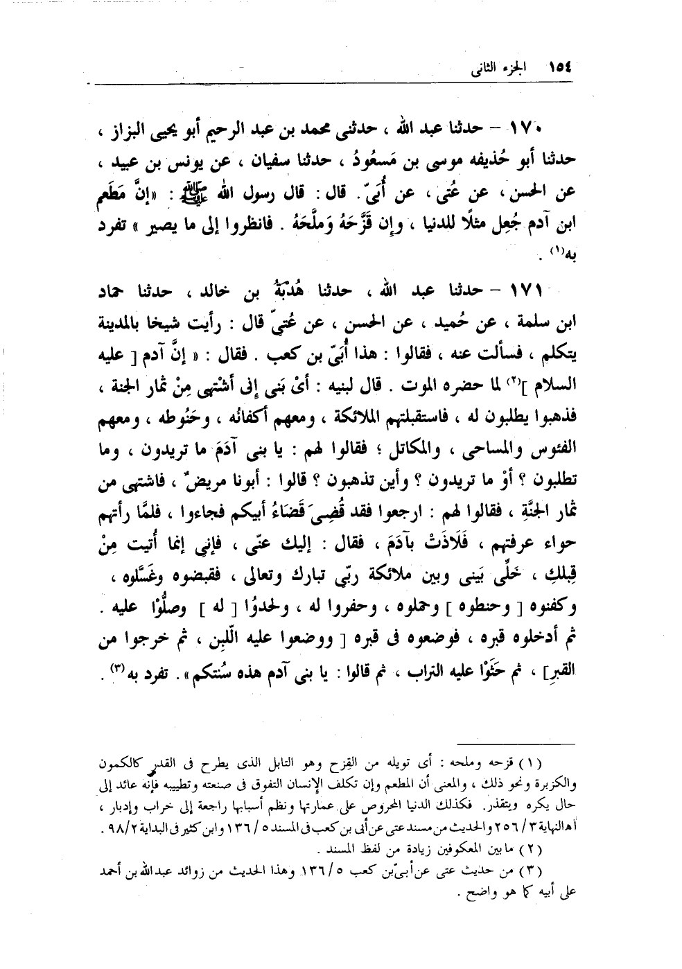 170 - حدثنا عبد الله، حدثني محمد بن عبد الرحيم أبو يحيى البزاز، حدثنا أبو حُذيفة موسى بن مسعود، حدثنا سفيان، عن يونس بن عبيد، عن الحسن، عن عُتي، عن أُبيّ. قال: قال رسول الله - صلى الله عليه وسلم -: (إنَّ مَطَعم بن آدم جُعِل مثلاً للدنيا، وإن قَزَّحَهُ وملَّحَهُ. فانظروا إلى ما يصير) تفرد به (¬1) .