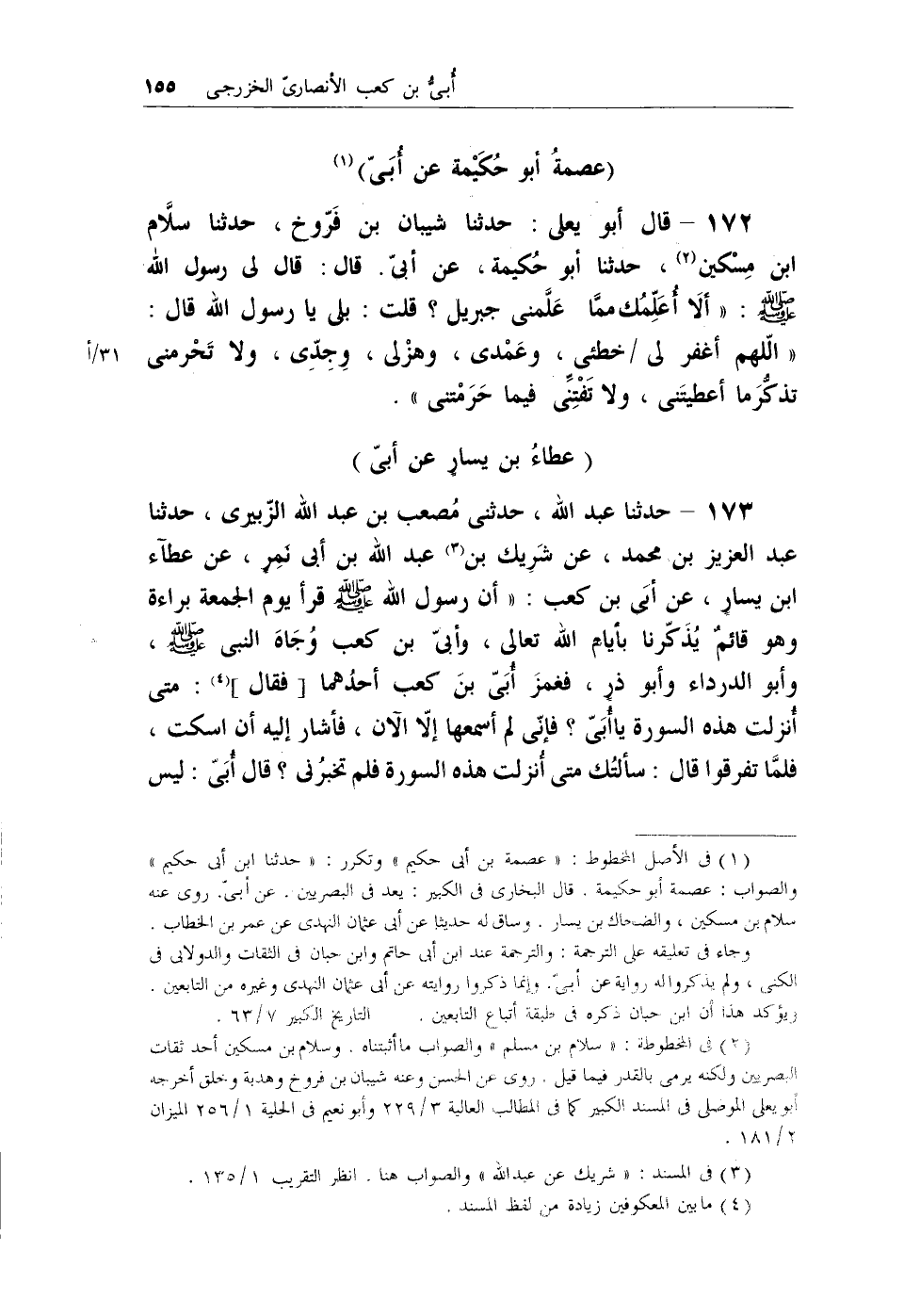 (¬1) في الأصل المخطوط: (عصمة بن أبي حكيم) وتكرر: (حدثنا ابن أبي حكيم) والصواب: عصمة أبو حكيمة. قال البخاري في الكبير: يعد في البصريين. عن أبيّ. روى عنه سلام بن مسكين، والضحاك بن يسار. وساق له حديثاً عن أبي عثمان النهدي عن عمر بن الخطاب.