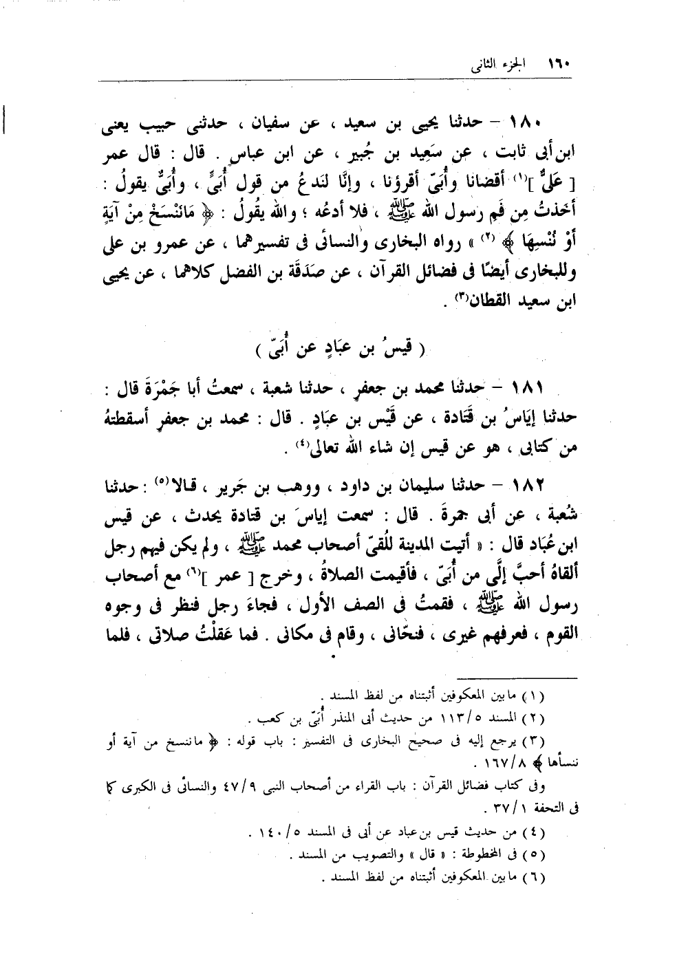 180 - حدثنا يحيى بن سعيد، عن سفيان، حدثني حبيب يعني ابن أبي ثابت، عن سعيد بن جُبير، عن ابن عباس. قال: قال عمر [عَليٌّ] (¬1) أقضانا وأُبَيّ أقرؤنا، وإنَّا لندعُ من قول أُبَيٍّ، وأُبيٌّ يقولُ: أخذتُ من فم رسول الله - صلى الله عليه وسلم -، فلا أدعهُ؛ والله يقولُ: {مَا نَنسَخْ مِنْ آيَةٍ أَوْ نُنسِهَا} (¬2) (رواه البخاري والنسائي