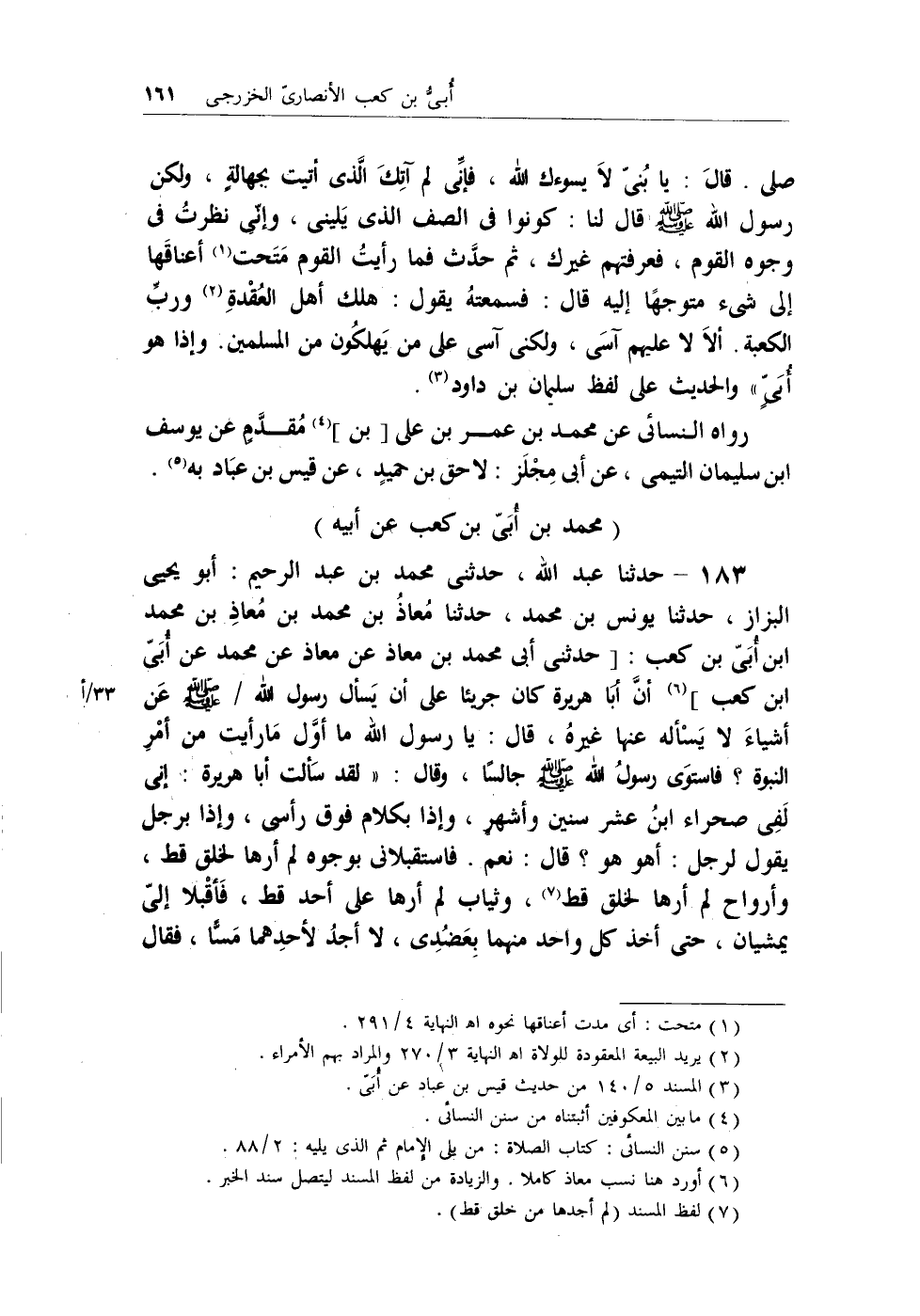 183 - حدثنا عبد الله، حدثني محمد بن عبد الرحيم: أبو يحيى البزاز، حدثنا يونس بن محمد، حدثنا مُعاذٌ بن محمد بن مُعاذِ بن محمد بن أُبي بن كعب: [حدثني أبي محمد بن معاذ عن معاذ عن محمد عن أُبي بن كعب] (¬1) أنَّ أبا هريرة كان جريئاً على أن يَسأل رسول الله/ - صلى الله عليه وسلم - عن أشياء لا يسأله عنها غيرهُ، قال: يارسول الله ما أوَّل ما رأيت من أمْرِ النبوة؟ فاستوى رسولُ الله - صلى الله عليه وسلم - جالساُ، وقال: (لقد سَألتْ أبا هريرة: إني لَفِي صحراء ابنُ عشر سنين وأشهرٍ، وإذا بكلام فوق رأسي، وإذا برجل يقول لرجل: أهو هو؟ قال: نعم. فاستقبلاني بوجوه لم أردها لخلق قط، وأرواح لم أرها لخلق قط (¬2) ، وثياب لم أرها على أحد قط، فأقبلا إلي يمشيان، حتى أخذ كل واحد منهما بعضدي، لا أجدُ لأحدِهما مساً، فقال