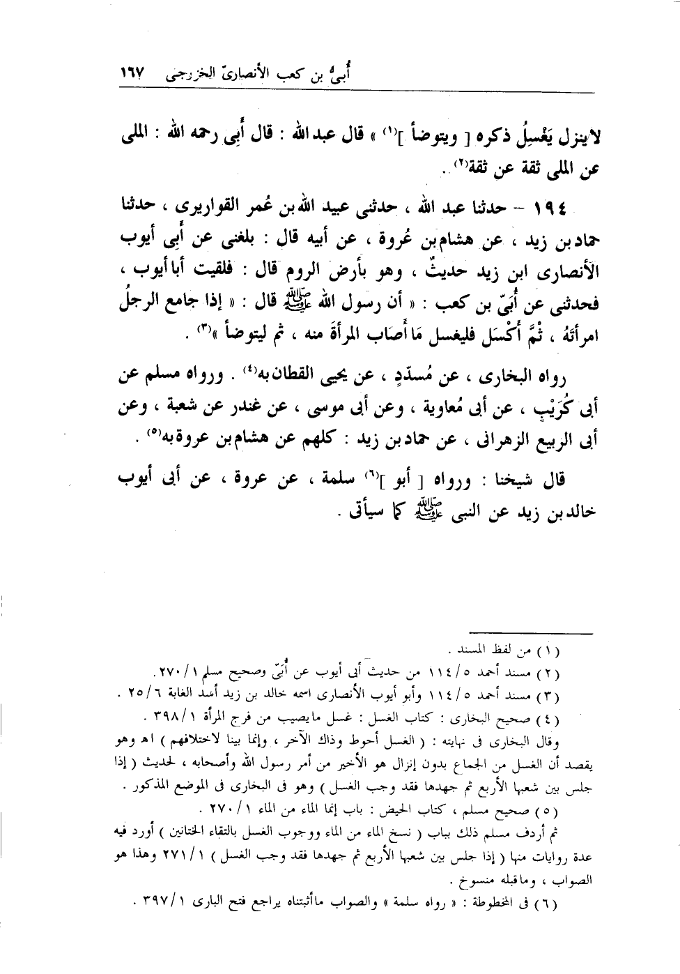 194 - حدثنا عبد الله، حدثني عبيد الله بن ُعمر القواريري، حدثنا حماد ابن زيد، عن هشام بن عُروة، عن أبيه قال: بلغني عن أبي أيوب الأنصاري بن زيد حديثٌ، وهو بأرض الروم قال: فلقيت أبا أيوب، فحدثني عن أُبي بن كعب: (أن رسول الله - صلى الله عليه وسلم - قال: (إذا جامع الرجلُ امرأتهُ، ثم اكْسَل فليغسل ما أصاب المرأة منه، ثم ليتوضأ) (¬1) .