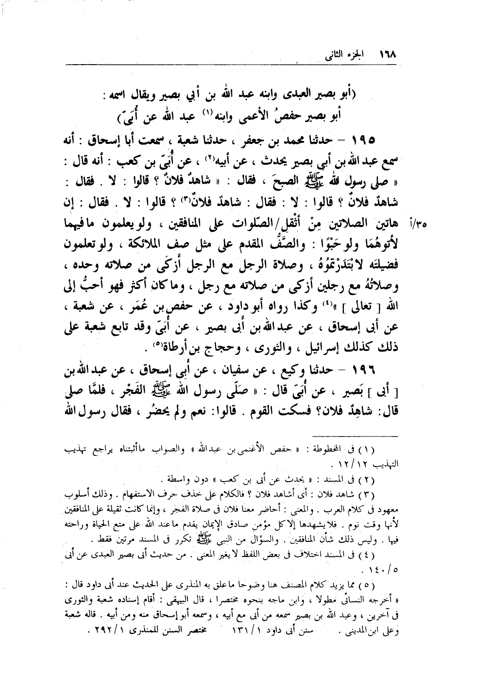 196 - حدثنا وكيع، عن سفيان، عن أبي إسحاق، عن عبد الله بن [أبي] بَصير، عن أُبَي قال: (صلى رسول الله - صلى الله عليه وسلم - الفجْر، فلما صلى قال: شاهدٌ فلان؟ فسكت القوم. قالوا: نعم ولم يحضُر، فقال رسول الله