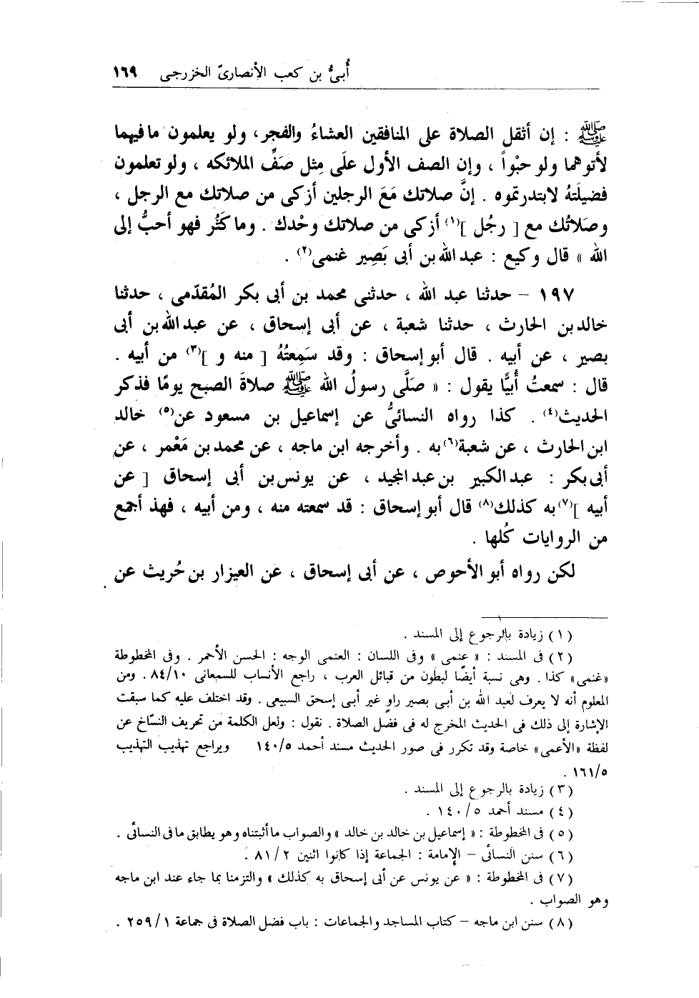 (¬2) في المسند: (عنمى) وفي اللسان: العنمى الوجه: الحسن الأحمر. وفي المخطوطة (غنمي) كذا. وهي نسبة أيضاً لبطون من قبائل العرب، راجع الأنساب للسمعاني 10/84. ومن المعلوم أنه لا يعرف لعبد الله بن أبي بصير راوٍ غير أبي إسحاق السبيعي. وقد اختلف عليه كما سبقت الإشارة إلى ذلك في الحديث المخرج له في فضل الصلاة. تقول: ولعل الكلمة من تحريف النساخ عن لفظه (الأعمى) خاصة وقد تكرر في صور الحديث مسند أحمد 5/140 ويراجع تهذيب التهذيب 5/161.