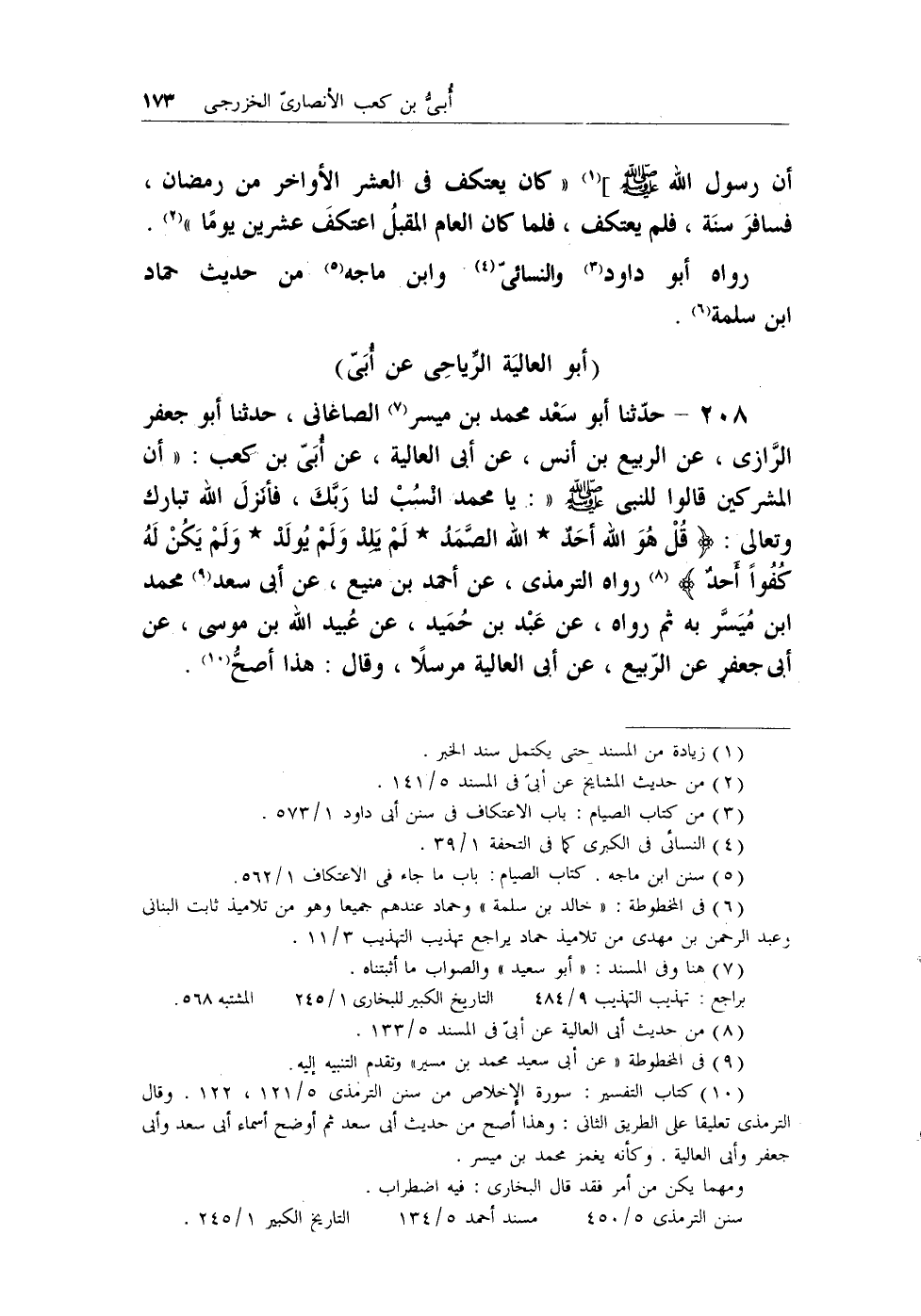 (¬4) كتاب التفسير: سورة الإخلاص من سنن الترمذي 5/121، 122. وقال الترمذي تعليقاً على الطريق الثاني: وهذا أصح من حديث أبي سعد ثم أوضح أسماء أبي سعد وأبي جعفر وأبي العالية. وكأنه يغمز محمد بن ميسر.