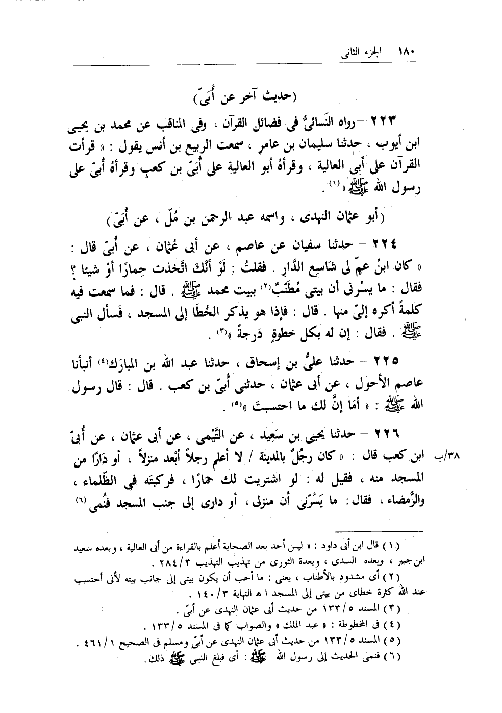 224 - حدثنا سفيان عن عاصم، عن أبي عُثمان، عن أُبيّ قال: (كان ابنُ عمٍ لي شاسع الدار. فقلتُ: لو أنك اتخذت حِماراً أو شيئاً؟ فقال: ما يسُرني أن بيتي مُطنَّبٌ (¬2) ببيت محمد - صلى الله عليه وسلم -. قال: فما سمعت فيه كلمةً أكره إليّ منها. قال: فإذا هو يذكر الخُطا إلى المسجد، فسأل النبي - صلى الله عليه وسلم -. فقال: إن له بكل خطوةٍ درجةً) (¬3) .