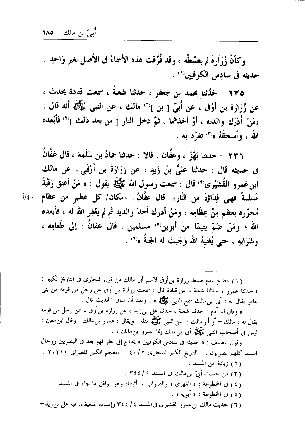 (¬1) يتضح عدم ضبط زرارة بن أوفى لاسم أبي مالك من قول البخاري في التاريخ الكبير: (حدثنا عمرو، حدثنا شُعبة، عن قتادة قال: سمعت زرارة بن أوفى عن رجل من قومه من بني عامر يقال له: أبي بن مالك سمع النبي - صلى الله عليه وسلم -) . وبعد أن ساق الحديث قال: