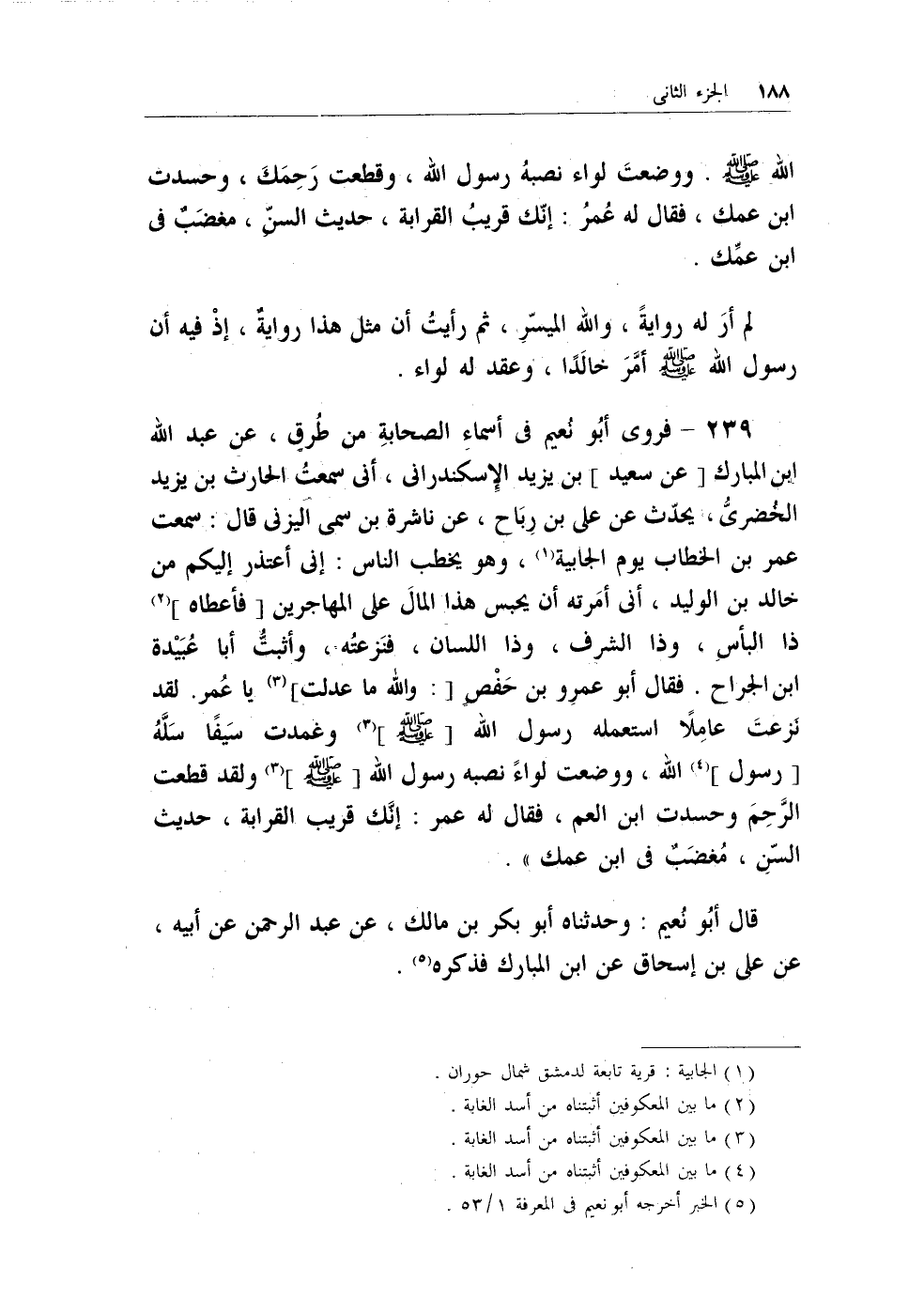 239 - فروى أبو نُعيم في أسماء الصحابة من طُرقٍ، عن عبد الله بن المبارك [عن سعيد] بن يزيد الإسكندراني، أني سمعتُ الحارث بن يزيد الخُضريُّ، يحدث عن علي بن رباح، عن ناشرة بن سمي اليزني قال: سمعت عمر بن الخطاب يوم الجابية (¬1) ، وهو يخطب الناس: إني أعتذر إليكم من خالد بن الوليد، أني أمَرته أن يحبس هذا المال على المهاجرين [فأعطاه] (¬2) ذا البأسِ، وذا الشرف، وذا اللسان، فنزعتُه، وأثبتُّ أبا عُبيدة بن الجراح. فقال أبو عمرو بن حفصٍ [: والله ما عدلت] (¬3)