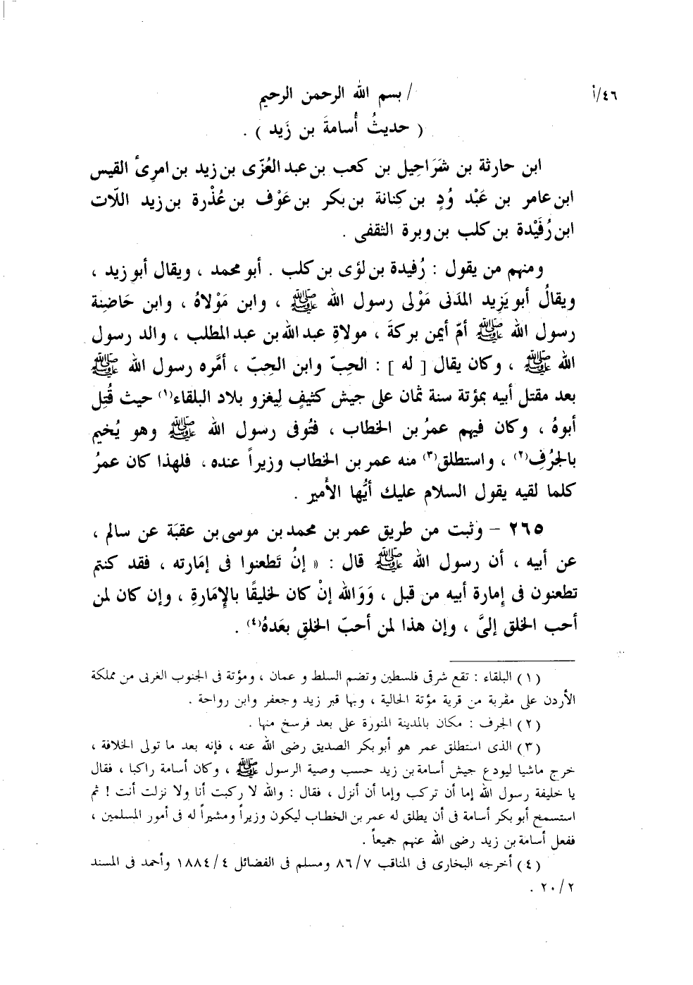 (¬3) الذي استطلق عمر هو أبو بكر الصديق رضي الله عنه، فإنه بعد ما تولى الخلافة، خرج ماشياً ليودع جيش أسامة بن زيد حسب وصية الرسول - صلى الله عليه وسلم -، وكان أسامة راكباً، فقال ياخليفة رسول الله إما أن تركب وإما أن أنزل، فقال: والله لا ركبت أنا ولا نزلت أنت! ثم استسمخ أبو بكر أسامة في أن يطلق له عمر بن الخطاب ليكون وزيراً ومشيراً له في أمور المسلمين، ففعل أسامة ابن زيد رضي الله عنهم جميعاً.