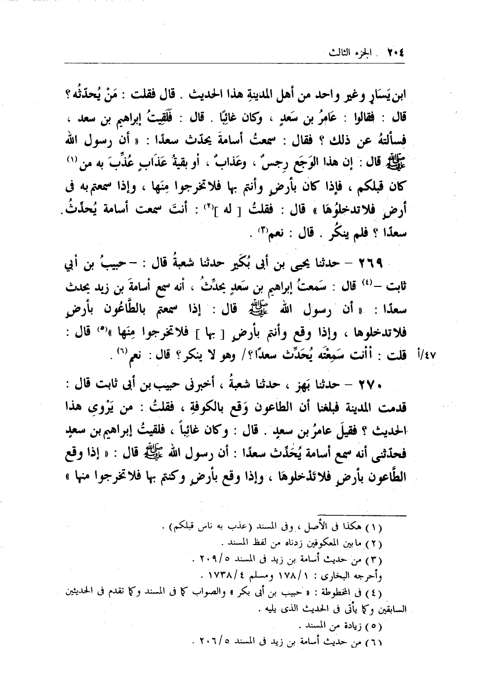 270 - حدثنا بَهز، حدثنا شعبةُ، أخبرني حبيب بن أبي ثابت قال: قدمت المدينة فبلغنا أن الطاعون وقع بالكوفة، فقلتُ: من يَرْوي هذا الحديث؟ فقيلَ عامرُ ابن سعدٍ. قال: وكان غائِباً، فلقيتُ إبراهيم بن سعدٍ فحدثني أنه سمع أسامة يُحدِّث سعداً: أن رسول الله - صلى الله عليه وسلم - قال: (إذا وقع الطَّاعون بأرضٍ فلا تدخلوها، وإذا وقع بأرضٍ وكنتم بها فلا تخرجوا منها)