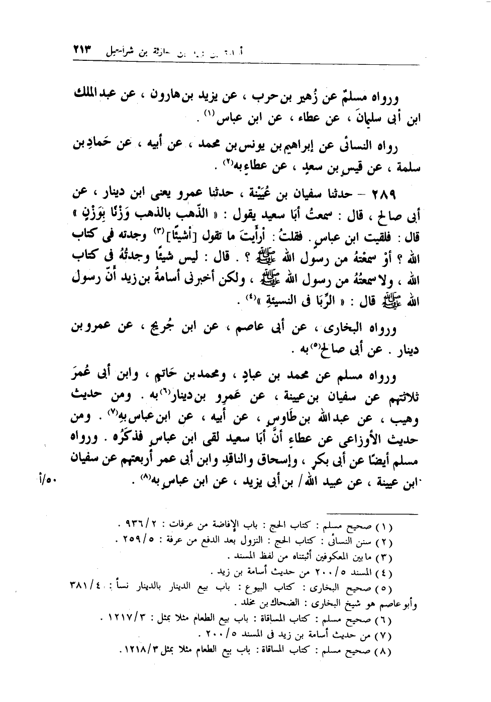 289 - حدثنا سفيان بن عُيَيْنة، حدثنا عمرو يعني ابن دينار، عن أبي صالح، قال: سمعتُ أبَا سعيد يقول: (الذهب بالذهب وزْناً بوزْنٍ) قال: فلقيت ابن عباسٍ. فقلتُ: أرأَيتَ ما تقول [أشيئاً] (¬1) وجدته في كتاب الله؟ أو سمعْتهُ من رسول الله - صلى الله عليه وسلم -؟ قال: ليس شيئاً وجدتُهُ في كتاب الله، ولا سمعتُهُ من رسول الله - صلى الله عليه وسلم -،