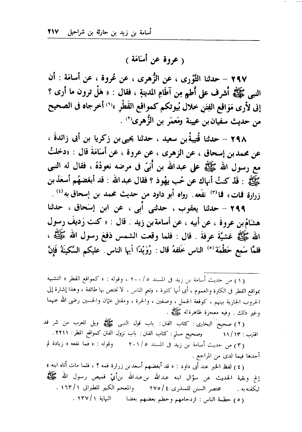 299 - حدثنا يعقوب، حدثني أبي، عن ابن إسحاق، حدثنا هشامُ بن عروةَ، عن أبيه، عن أسامة بن زيد. قال: (كنت رَديفَ رسول الله - صلى الله عليه وسلم - عشيَّةَ عرفةَ. قال: فلما وقعت الشمس دَفعَ رسول الله - صلى الله عليه وسلم -، فلمَّا سمع حطْمَةَ (¬5) الناس خلفهُ قال: رُويْداً أيها الناس. عليكم السكينةُ فإنَّ