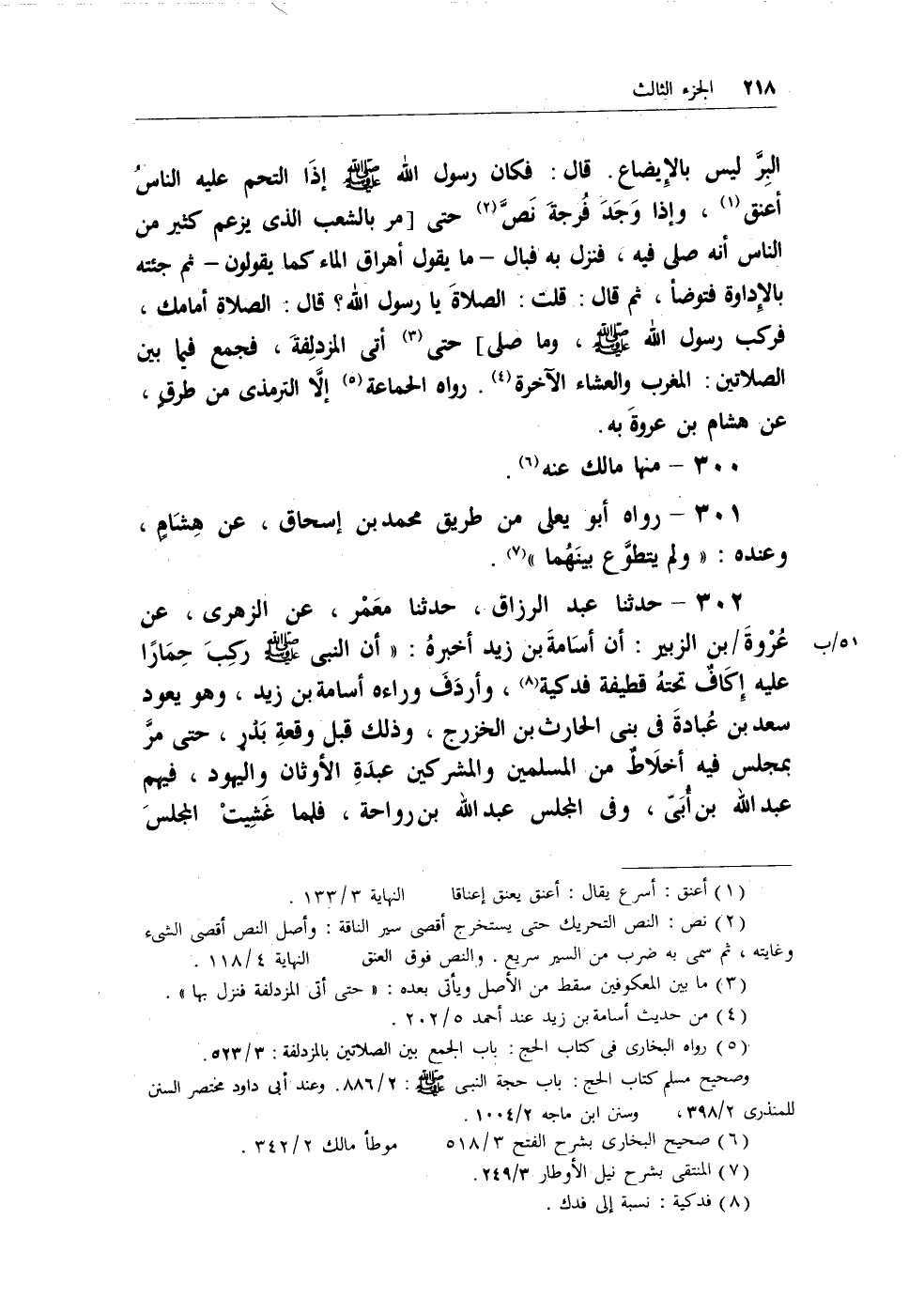 البِرَّ ليس بالإيضاع. قال: فكان رسول الله - صلى الله عليه وسلم - إذا التحم عليه الناسُ أعتق (¬1) ، وإذا وَجَدَ فُرجةَ نص (¬2) حتى [مر بالشعب الذي يزعم كثير من الناس أنه صلى فيه، فنزل به فبال - ما يقول أهراق الماء كما يقولون - ثم جئته بالإداوة فتوضأ، ثم قال: قلت: الصلاة يارسول الله؟ قال: الصلاة أمامك، فركب رسول الله - صلى الله عليه وسلم -، وماصلى] حتى (¬3) أتى المزدلفة، فجمع بين الصلاتين: المغرب والعشاء الآخرة (¬4) . رواه الجماعة (¬5) إلا الترمذي من طرقٍ، عن هشام بن عروة به.