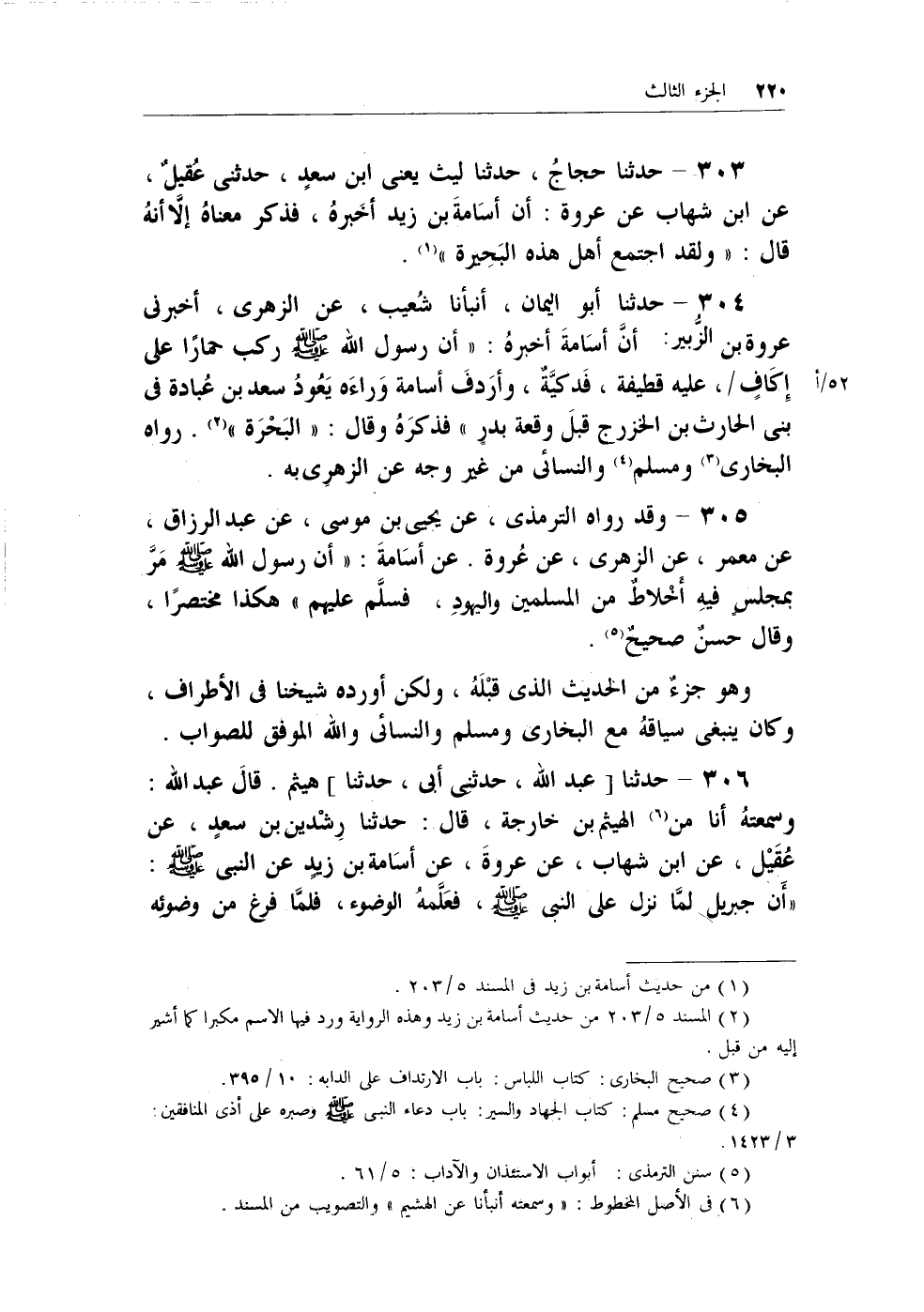 303 - حدثنا حجاجُ، حدثنا ليث يعني ابن سعدٍ، حدثني عُقيلٌ، عن ابن شهاب عن عروة: أن أسامة بن زيد أخبرهُ، فذكر معناهُ إلا أنهُ قال: (ولقد اجتمع أهل هذه البحيرة) (¬1) .