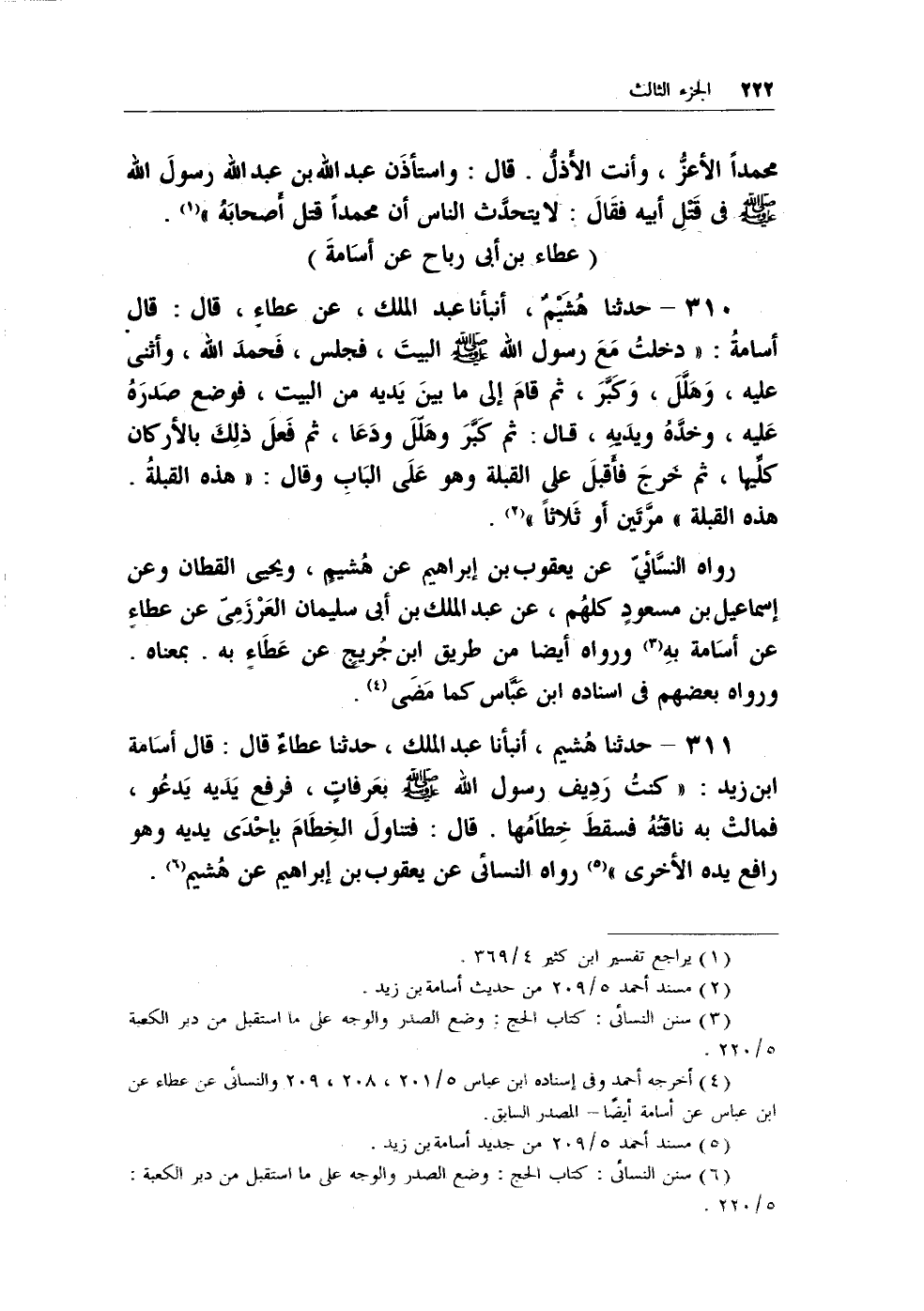 (¬3) أخرجه أحمد وفي إسناده ابن عباس 5/201، 208، 209 والنسائي عن عطاء عن ابن عباس عن أسامة أيضاً - المصدر السابق.