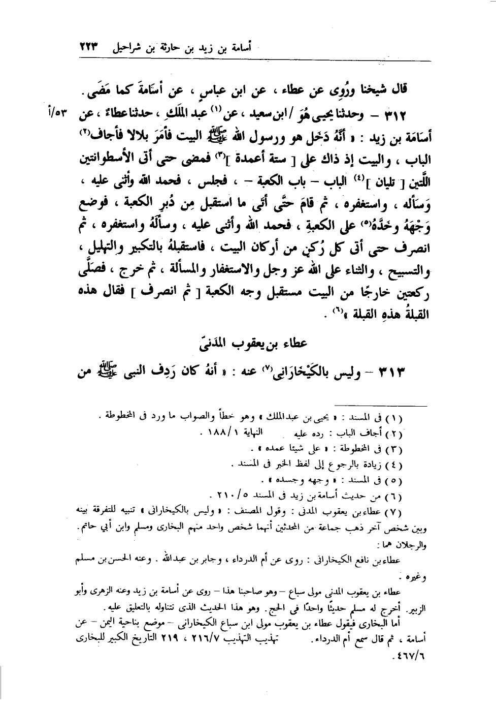 312 - وحدثنا يحيى هُوَ/ ابن سعيد، عن (¬1) عبد الملك، حدثنا عطاءٌ، عن أسامة بن زيد: (أنه دَخَل هو ورسول الله - صلى الله عليه وسلم - البيت فأمَرَ بلالا فأجاف (¬2) الباب، والبيت إذ ذاك على [ستة أعمدة] (¬3) فمضى حتى أتى الأسطوانتين اللِّتين [تليان] (¬4) الباب - باب الكعبة -، فجلس، فحمد الله وأثنى عليه، وسَأله، واستغفره، ثم قام حتَّى أتَى ما استقبل مِن دُبرِ الكعبة، فوضع وَجْهَهُ وخَدَّهُ (¬5) على الكعبةِ، فحمد الله وأثنى عليه، وسألَهُ واستغفره، ثم انصرف حتى أتى كل رُكنٍ من أركان البيت، فاستقبلهُ بالتكبير والتهليل، والتسبيح، والثناء على الله عز وجل والاستغفار والمسألة، ثم خرج، فصَلَّى ركعتين خارجاً من البيت مستقبل وجه الكعبة [ثم انصرف] فقال هذه القبلةُ هذهِ القبلة) (¬6) .