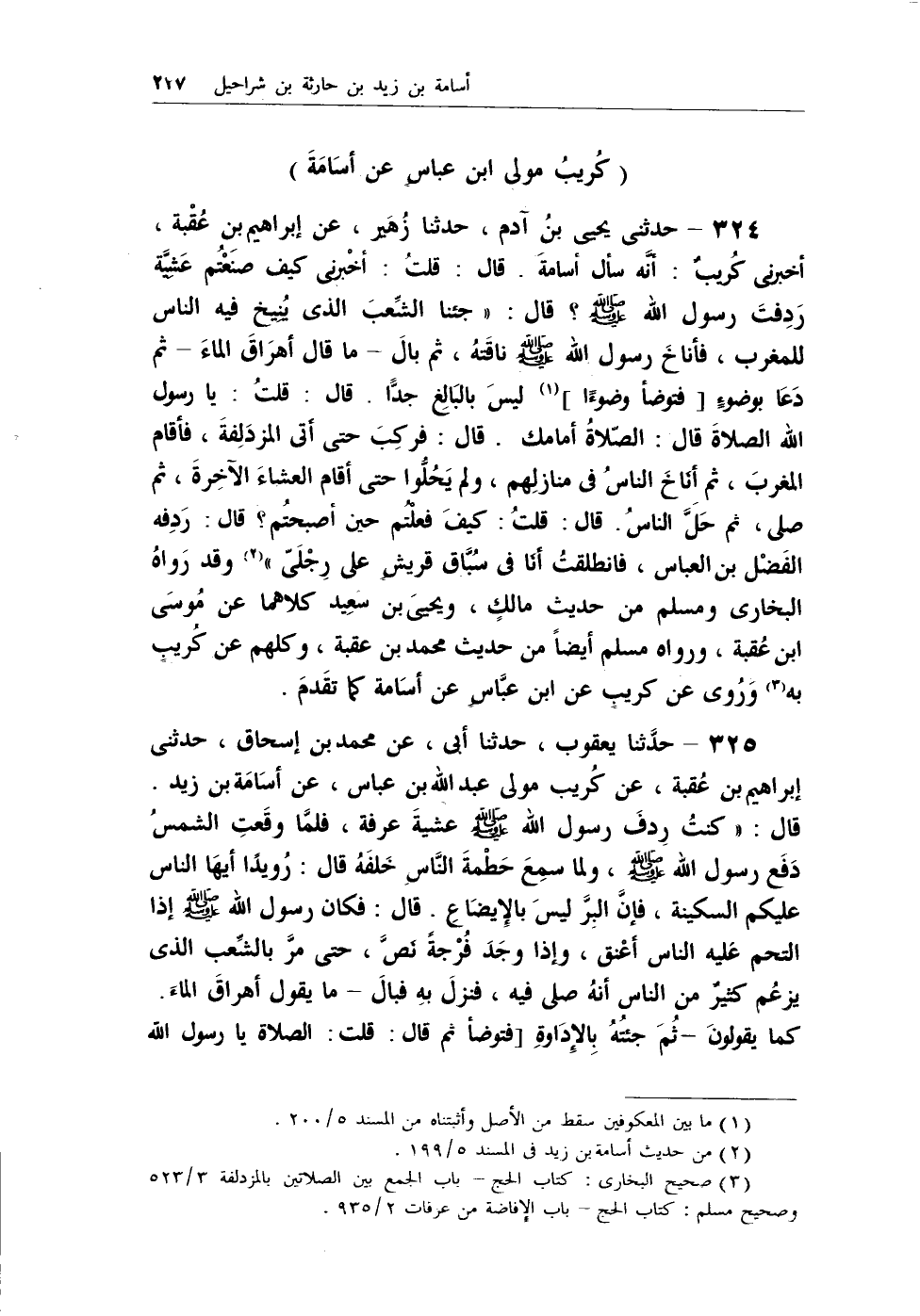 325 - حدثنا يعقوب، حدثنا أبي، عن محمد بن إسحاق، حدثني إبراهيم ابن عُقبة، عن كُريب مولى عبد الله بن عباس، عن أسامَة بن زيد. قال: (كنتُ ردفَ رسول الله - صلى الله عليه وسلم - عشيةَ عرفة، فلمَّا وقعت الشمسُ دَفَع رسول الله - صلى الله عليه وسلم -، ولما سمِعَ حطمةَ الناس خَلفَهُ قال: رُويداً أيها الناس عليكم السكينة، فإنَّ البِرَّ ليس بالإيضاعِ. قال: فكان رسول الله - صلى الله عليه وسلم - إذا التحم عليه الناس أَعْنق، وإذا وجدَ فُرْجةً نصَّ، حتى مرَّ بالشِّعب الذي يزعُم كثيرٌ من الناس أنهُ صلى فيه، فنزل به فبال - ما يقول أهراقَ الماءَ. كما يقولون - ثمَ جئتهُ بالإداوة [فتوضأ ثم قال: قلت: الصلاة يارسول الله