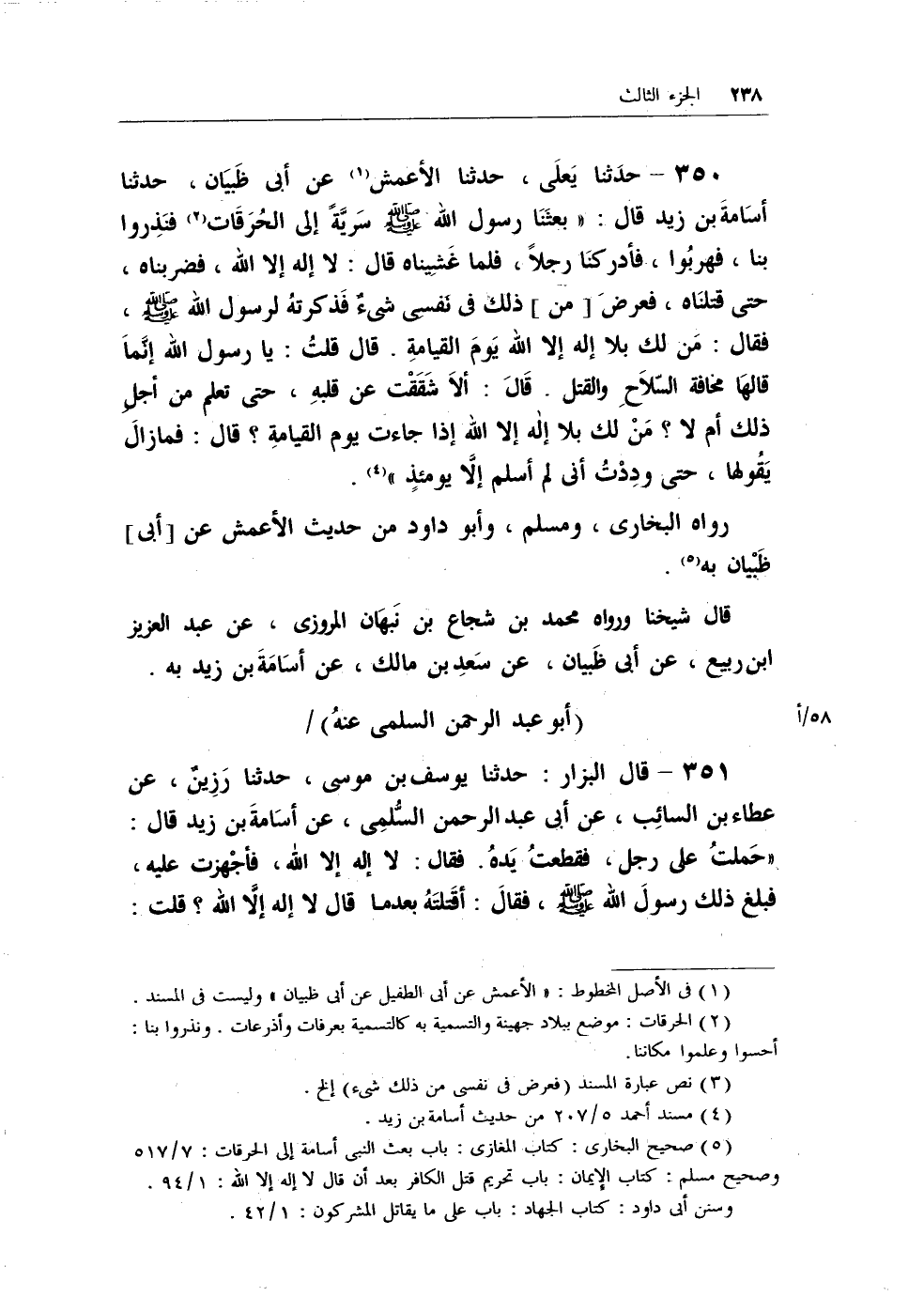 351 - قال البزار: حدثنا يوسف بن موسى، حدثنا رَزِينٌ، عن عطاء بن السائب، عن أبي عبد الرحمن السُّلمي، عن أسَامة بن زيد قال: (حملتُ على رجل، فقطعتُ يَدهُ. فقال: لا إله إلا الله، فأجْهزت عليه، فبلغ ذلك رسول الله - صلى الله عليه وسلم -، فقالَ: أقتلتهُ بعدما قال لا إله إلاَّ الله؟ قلت: