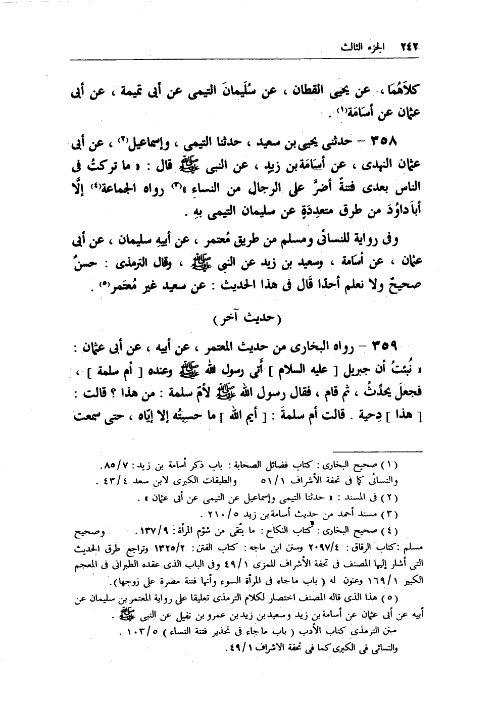358 - حدثني يحيى بن سعيد، حدثنا التيمي، وإسماعيل (¬1) ، عن أبي عثمان النهدي، عن أسَامَة بن زيدٍ، عن النبي - صلى الله عليه وسلم - قال: (ماتركتُ في الناس بعدي فتنةً أضرَّ على الرجال من النساء) (¬2) رواه الجماعة (¬3) إلاَّ أبَا داوُدَ من طرق متعددةٍ عن سليمان التيمي به.