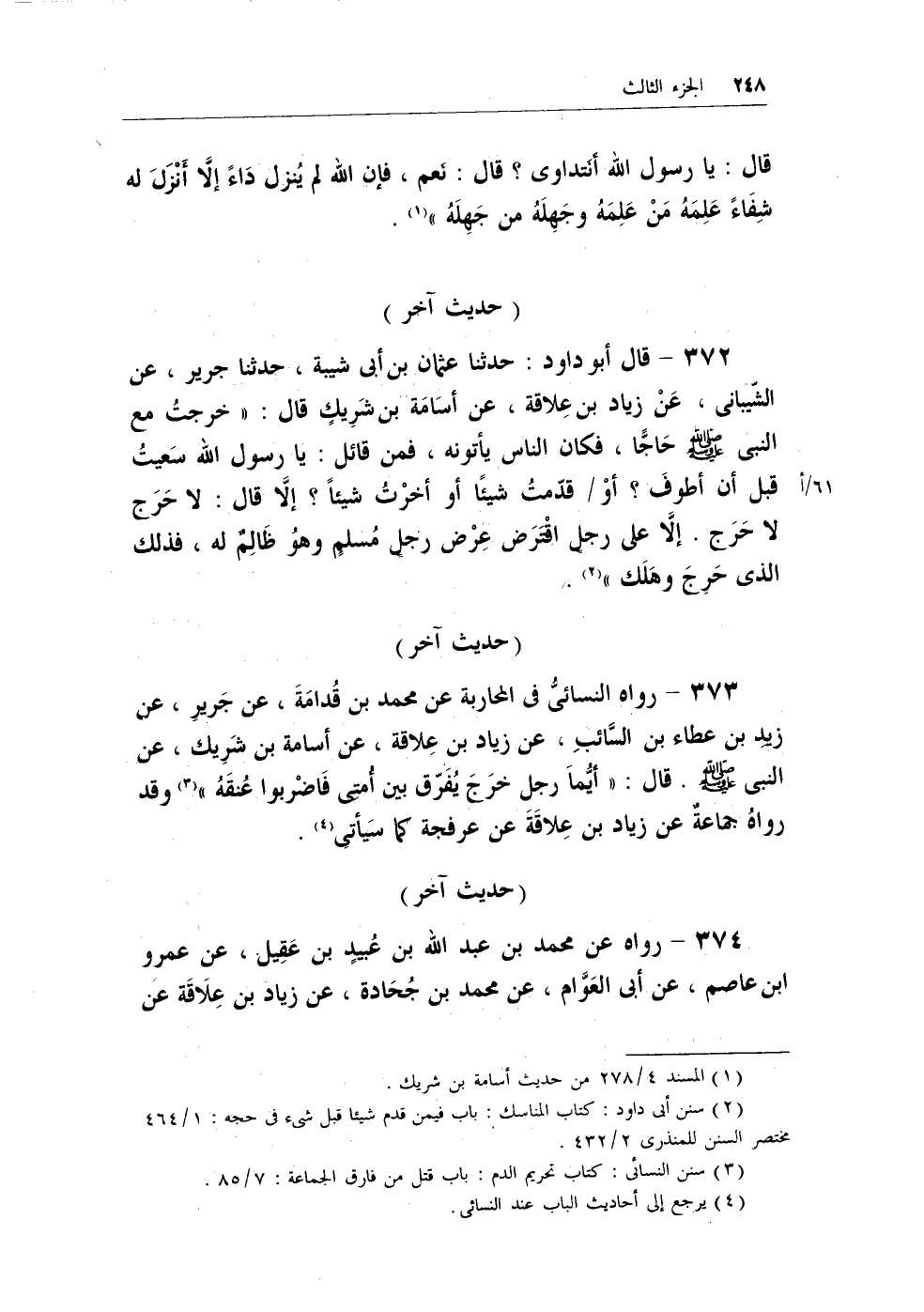 372 - قال أبو داود: حدثنا عثمان بن أبي شيبة، حدثنا جرير، عن الشيباني، عَنْ زياد بن عِلاقة، عن أسامة بن شريكٍ قال: (خرجتُ مع النبي - صلى الله عليه وسلم - حاجاً، فكان الناس يأتونه، فمن قائل: يارسول الله سَعيتُ قبل أن أطوفَ؟ أوْ/ قدمتُ شيئاً أو أخرْتُ شيئاً؟ إلا قال: لا حرج لا حرج. إلاَّ على رجلٍ اقترض عِرْض رجلٍ مسلمٍ وهوُ ظالمٌ له، فذلك الذي خرج وهلك) (¬1) .