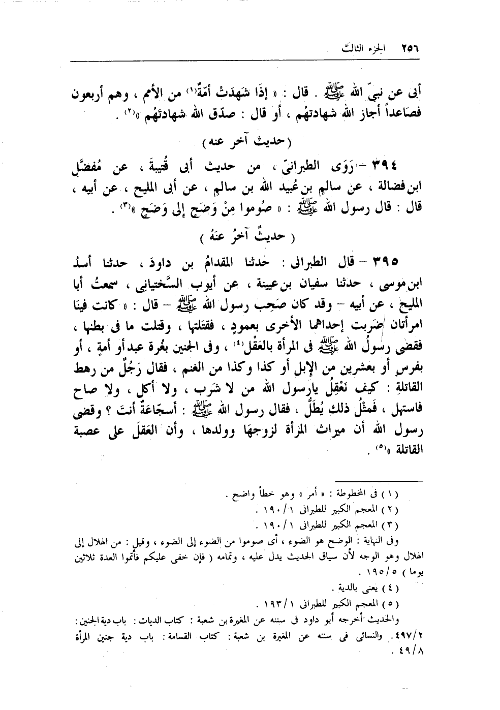 395 - قال الطبراني: حدثنا المقدامُ بن داودَ، حدثنا أسدُ بن موسى، حدثنا سفيان بن عيينة، عن أيوب السَّختياني، سمعتُ أبا المليح، عن أبيه - وقد كان صَحِب رسول الله - صلى الله عليه وسلم - قال: (كانت فينَا امرأتان ضَربت إحداهما الأخرى بعمودٍ، فقتلتها، وقتلت ما في بطنها، فقضى رسول الله - صلى الله عليه وسلم - في المرأة بالعَقْل (¬2) ، وفي الجنين بغُرة عبد أو أمةٍ، أو بفرسٍ أو بعشرين من الإبل أو كذا وكذا من الغنم، فقال رَجُلٌ من رهط القاتلةِ: كيف نَعْقِلُ يارسول الله من لا شرب، ولا أكل، ولا صاح فاستهل، فمثلُ ذلك يُطلُّ، فقال رسول الله - صلى الله عليه وسلم -: أسجَاعةٌ أنت؟ وقضى رسول الله أن ميراث المرأة لزوجها وولدها، وأن العقل على عصبة القاتلة) (¬3) .