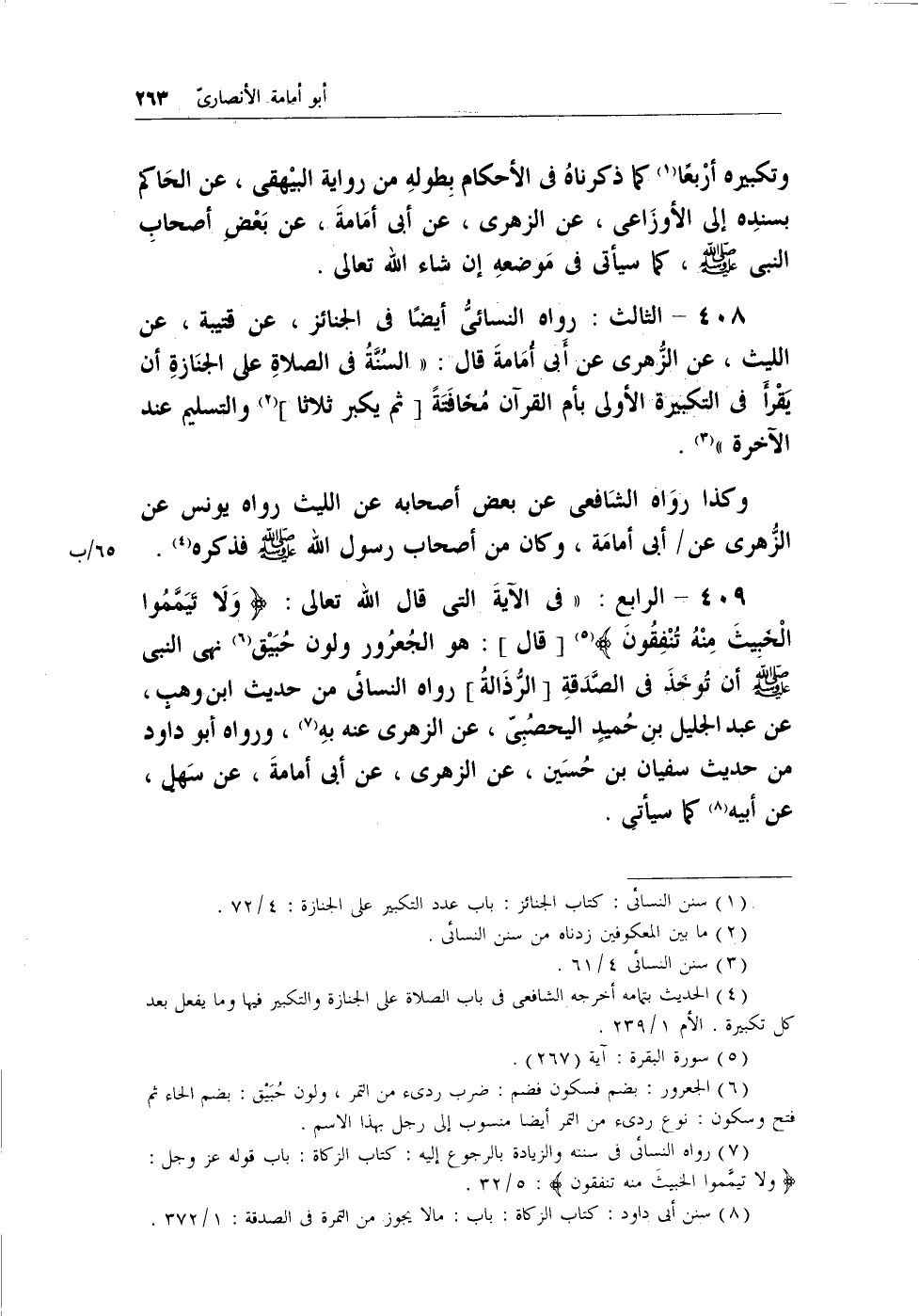 408 - الثالث: رواه النسائيُّ أيضاً في الجنائز، عن قتيبة، عن الليث، عن الزُّهري عن أبي أُمامة قال: (السُنَّةُ في الصلاةِ على الجنازة أن يقرأ في التكبيرة الأولى بأم القرآن مُخافتةً [ثم يكبر ثلاثا] (¬1) والتسليم عند الآخرة) (¬2) .