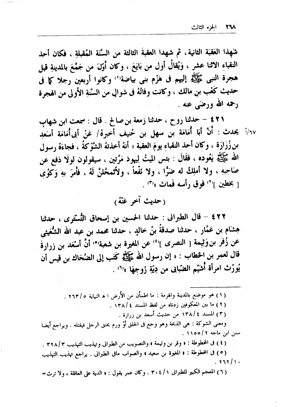 422 - قال الطبراني: حدثنا الحسين بن إسحاق التُسْتَري، حدثنا هِشَام ابن عمَّار، حدثنا صدقةُ بنُ خالدٍ، حدثنا محمد بن عبد الله الشُّعيثي عن زُفر بن وثيمة [النصري] (¬3) عن المغيرة بن شعبة (¬4) أنَّ أسعد بن زرارة قال لعمر بن الخطاب: (إن رسول الله - صلى الله عليه وسلم - كتب إلى الضحاك بن قيس أن يُورّث امرأة أُشيم الضبابي من دِيةِ زَوجِهَا) (¬5) .