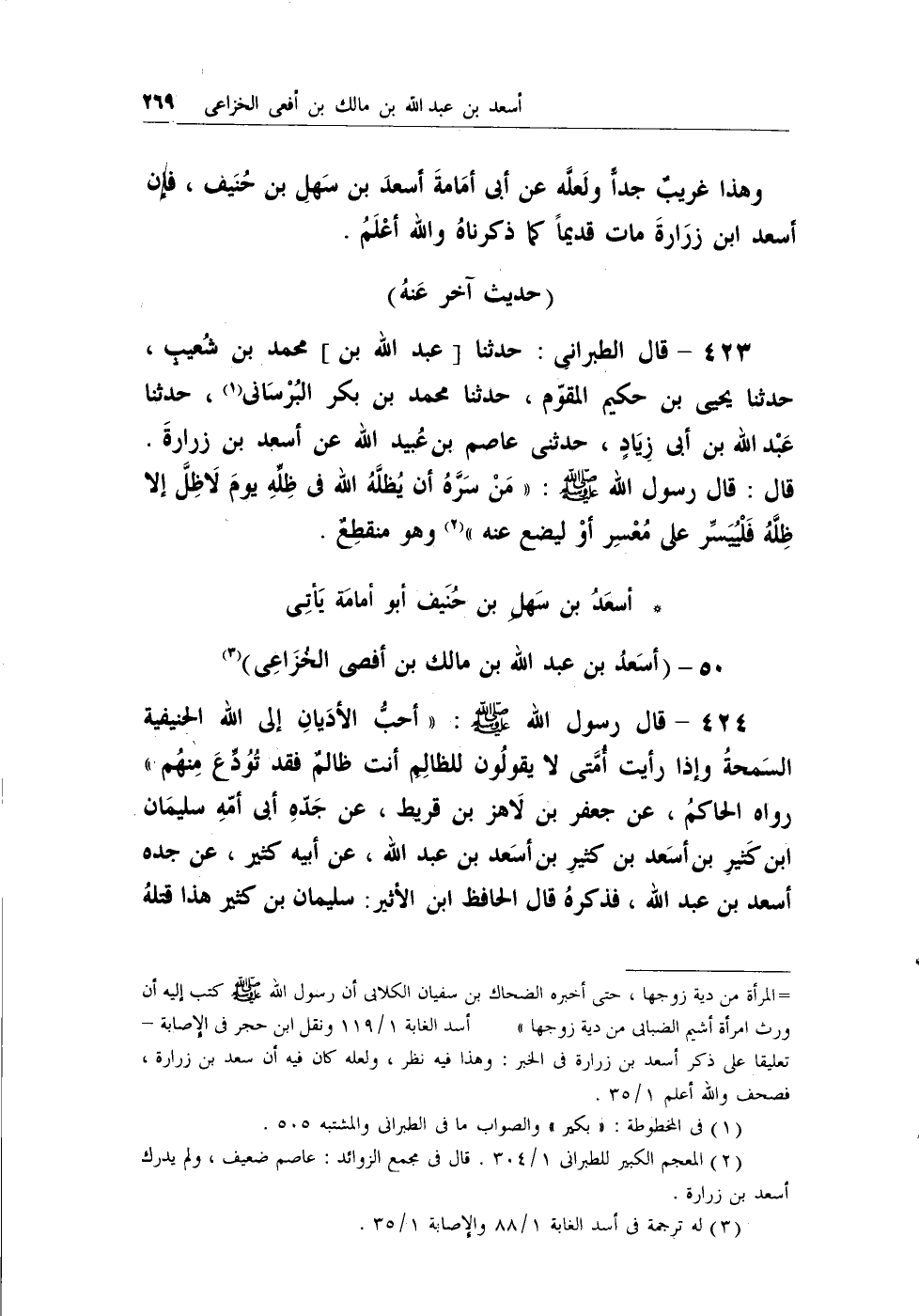 (¬2) المعجم الكبير للطبراني 1/304. قال في مجمع الزوائد: عاصم ضعيف، ولم يدرك أسعد بن زرارة.