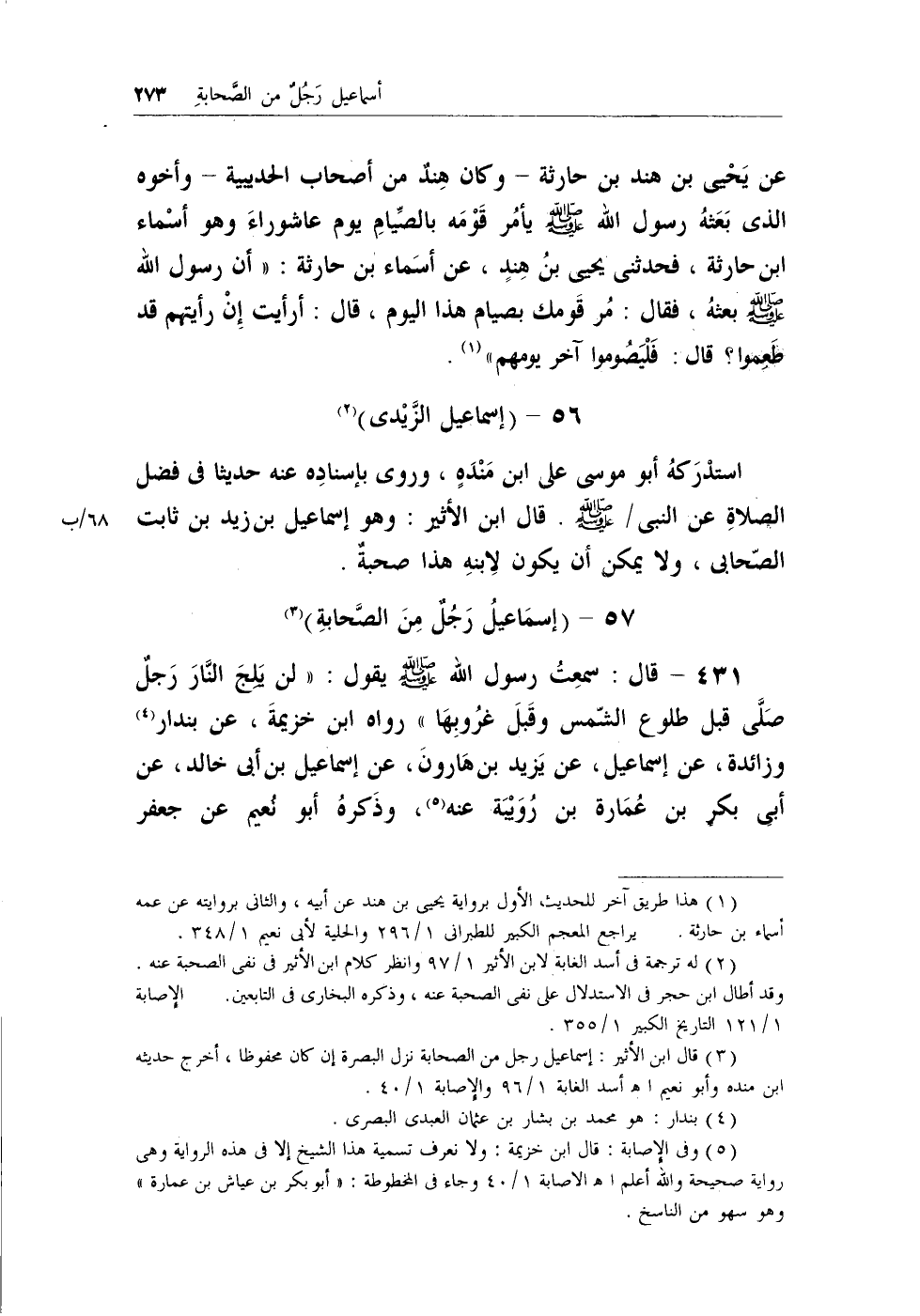 (¬2) قال ابن الأثير: إسماعيل رجل من الصحابة نزل البصرة إن كان محفوظا، أخرج حديثه ابن منده وأبو نعيم أهـ أسد الغابة 1/96 والإصابة 1/40.