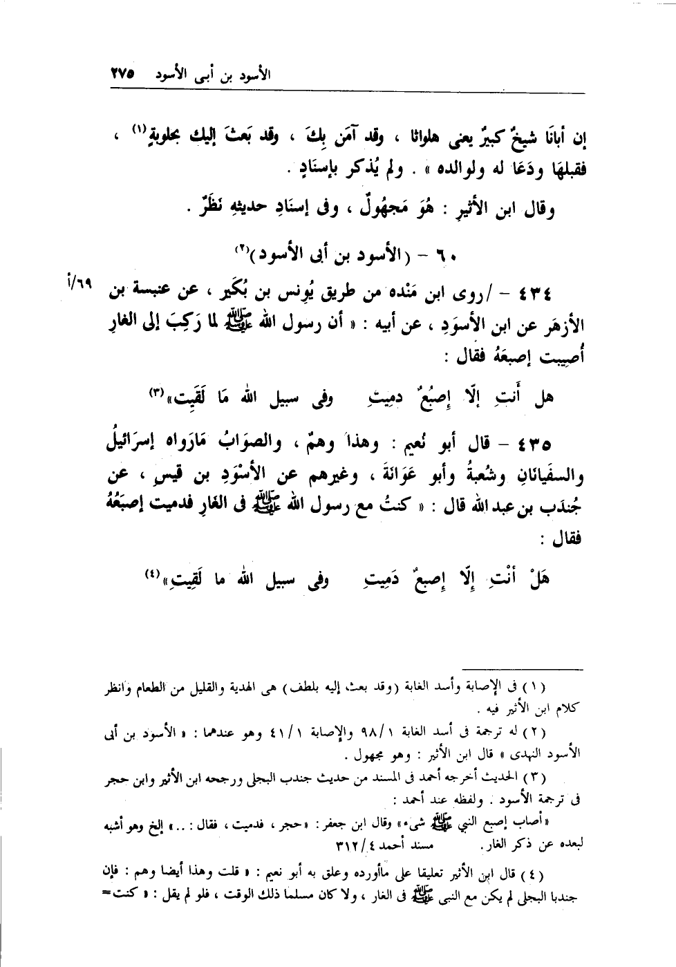 434 - / روى ابن منده من طريق يُونس بن بُكير، عن عنبسة بن الأزهر عن ابن الأسودِ، عن أبيه: (أن رسول الله - صلى الله عليه وسلم - لما رَكِبَ إلى الغارِ أُصيبت إصبعهُ فقال:
