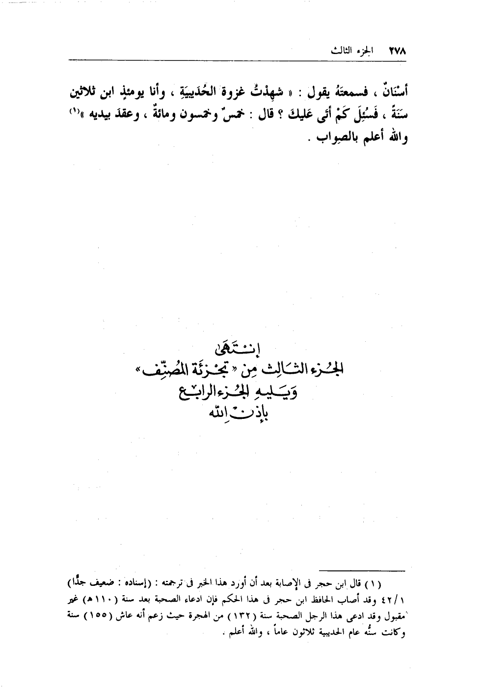 (¬1) قال ابن حجر في الإصابة بعد أن أورد هذا الخبر في ترجمته: (إسناده: ضعيف جداً) 1/42 وقد أصاب الحافظ ابن حجر في هذا الحكم فإن ادعاء الصحبة بعد سنة (110هـ) غير مقبول وقد ادعى هذا الرجل الصحبة سنة (132) من الهجرة حيث زعم أنه عاش (155) سنة وكانت سنُّه عام الحديبية ثلاثون عاماً، والله أعلم.
