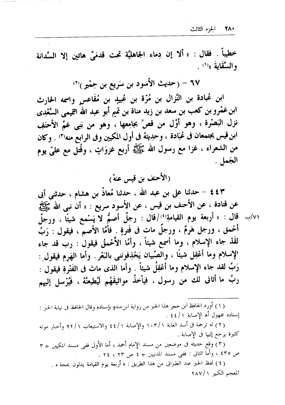 443 - حدثنا علي بن عبد الله، حدثنا مُعاذُ بن هشام، حدثني أبي عن قتادة، عن الأحنف بن قيس، عن الأسود سريع: (أن نبي الله - صلى الله عليه وسلم - قال: (أربعة يوم القيامةِ (¬3) / قال: رجلٌ أصمُّ لا يسمع شيئاً، ورجلٌ أحْمق، ورجل هَرِمٌ، ورجلٌ مات في فترةٍ. فأمَّا الأسم، فيقول: ربِّ لقد جاء الإسلام، وما أسمع شيئاً، وأما الأحمقُ فيقول: رب قد جاء الإسلام وما أعْقِل شيئاً، والصِّبيان يحْذِفونني بالبعْر. وأما الهَرِم فيقول: ربِّ لقد جاء الإسلام وما أعْقِلُ شيئاً. وأما الذي مات في الفَتْرةِ فيقول: ربِّ ما أتَاني لك من رسول، فيأخذُ مواثيقهُم ليُطيعنَّهُ، فيُرسل إليهم