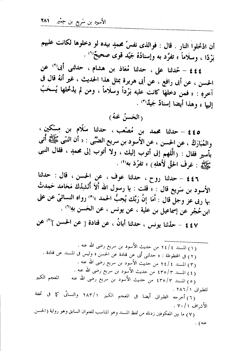 446 - حدثنا روح، حدثنا عوف، عن الحسن، قال: حدثنا الأسود بن سريع قال: (قلت: يارسول الله ألا أُنْشِدُكَ محامد حمدتُ بها ربي عز وجل قال: أمَا إنَّ ربَّك يُحبُّ الحمد) (¬4) رواه النسائي عن علي بن حُجْر عن إسماعيل بن علية، عن يونس، عن الحسن به (¬5) .