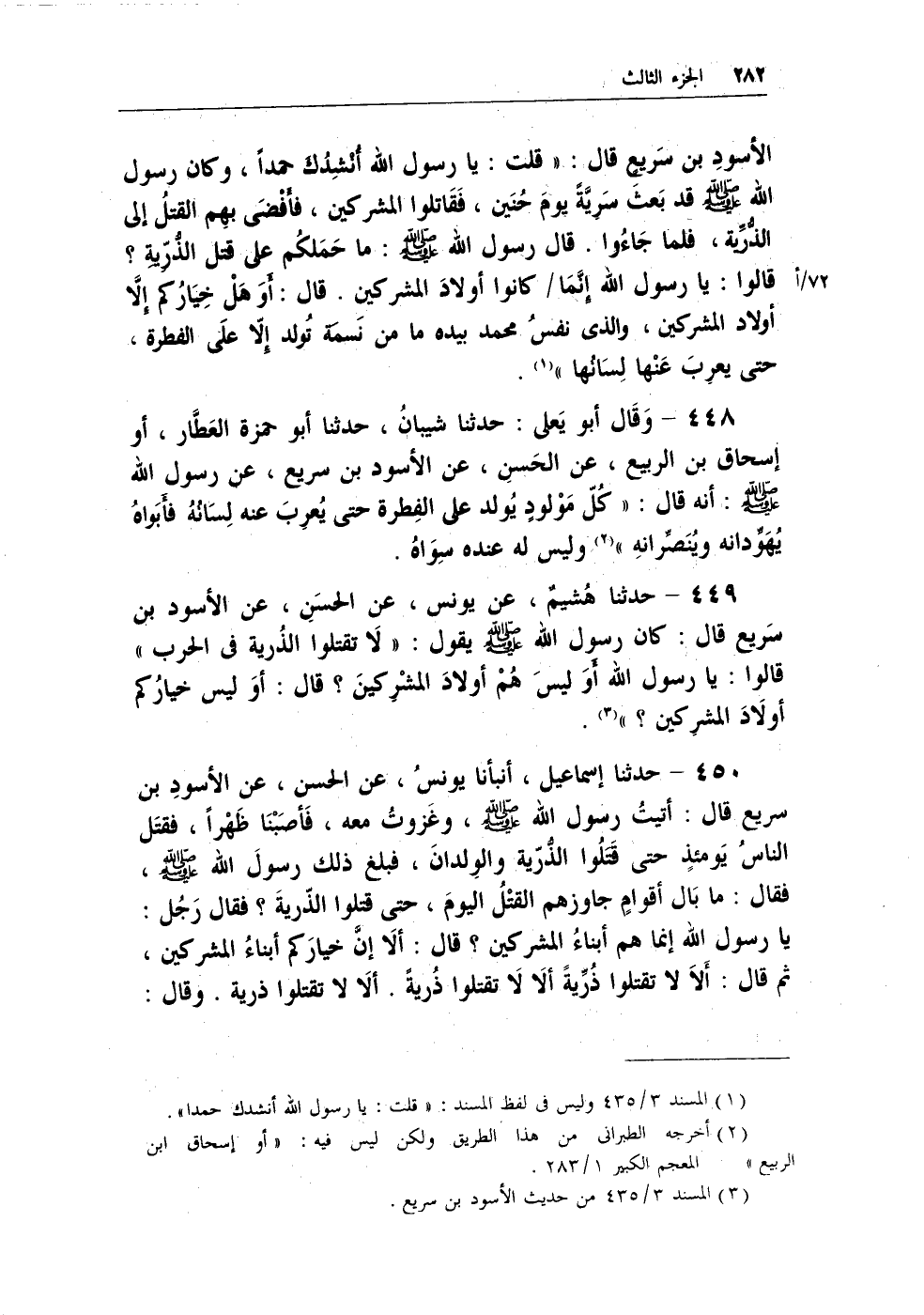 450 - حدثنا إسماعيل، أنبأنا يونسُ، عن الحسن، عن الأسود بن سريع قال: أتيتُ رسول الله - صلى الله عليه وسلم -، وغزوتُ معه، فأصبنا ظهْراً، فقتل الناسُ يومئذٍ حتى قَتَلُوا الذُرية والولدان، فبلغ ذلك رسول الله - صلى الله عليه وسلم -، فقال: ما بال أقوامٍ جاوزهم القتْلُ اليومَ، حتى قتلوا الذرية؟ فقال رجُل: يارسول الله إنما هم أبناءُ المشركين؟ قال: ألاَ إنَّ خياركم أبناءُ المشركين، ثم قال: أَلاَ لا تقتلوا ذُريةً ألا لا تقتلوا ذُريةً. ألاَ لا تقتلوا ذرية. وقال: