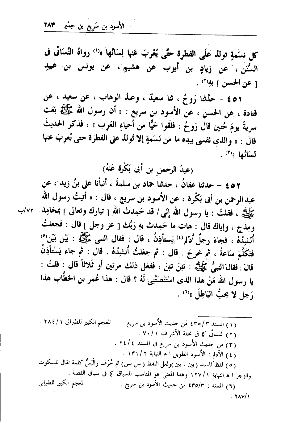 451 - حدثنا روحُ، ثنا سعيدٌ، وعبد الوهاب، عن سعيد، عن قتادة، عن الحسن، عن الأسود بن سريع: (أن رسول الله - صلى الله عليه وسلم - بعث سريةً يوم حُنين قال رَوحٌ: فلقوا حياً من أحياء العرب) ، فذكر الحديث قال: (والذي نفسي بيده ما من نسمةٍ إلا تُولدُ على الفطرة حتى يُعرِبَ عنها لسانُها) (¬1) .