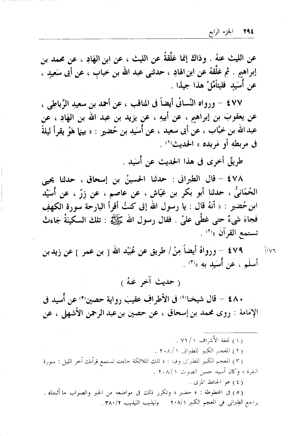 478 - قال الطبراني: حدثنا الحسينُ بن إسحاق، حدثنا يحيى الحُمّانيُّ، حدثنا أبو بكر بن عيّاش، عن عاصم، عن زرٍ، عن أُسيد بن حُضير: (أنه قال: يارسول الله إني كنتُ أقرأ البارحة سورة الكهف فجاء شئٌ حتى غطى عليَّ. فقال رسول الله - صلى الله عليه وسلم -: تلك السكينةُ جاءت تستمع القرآن) (¬2) .