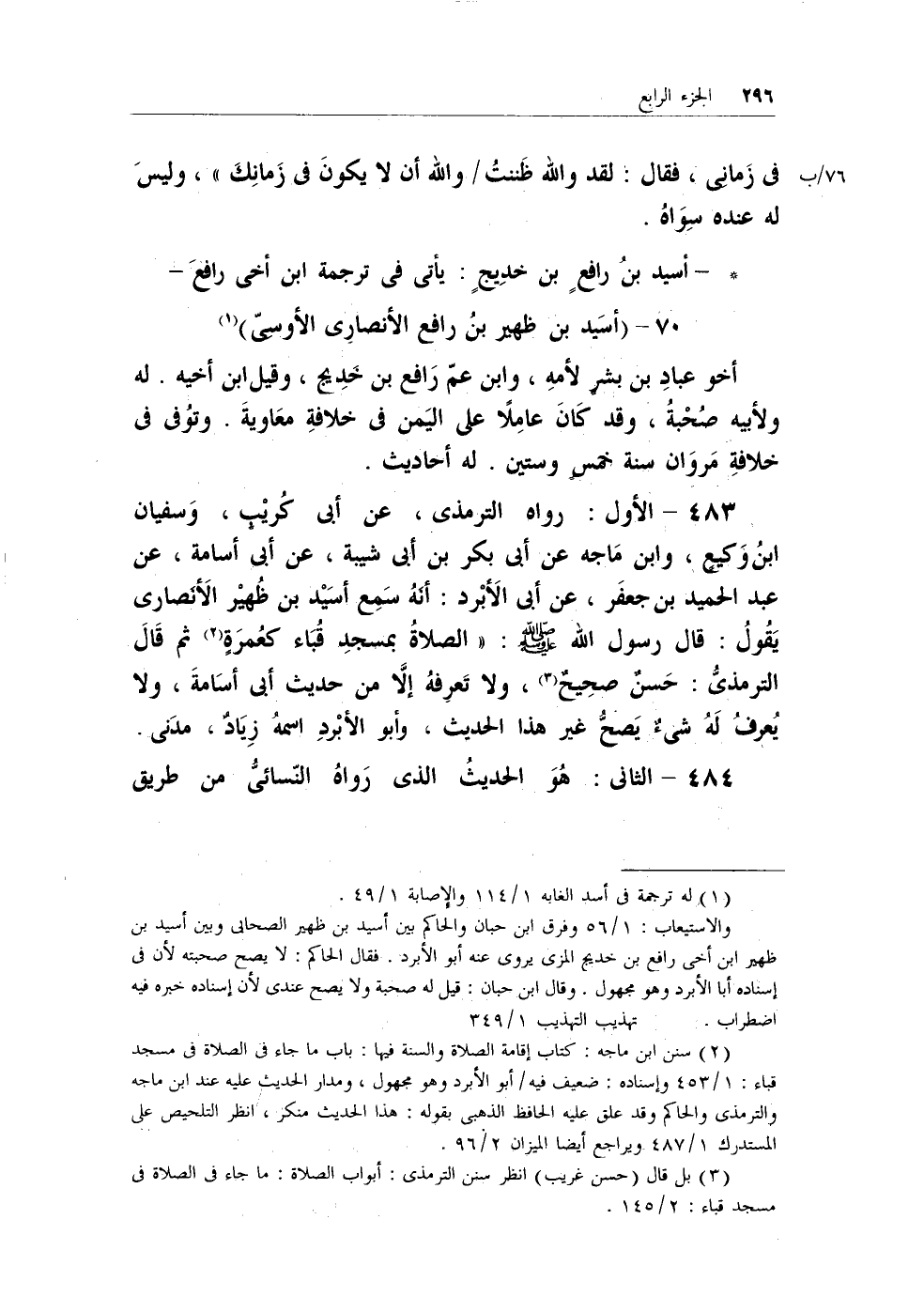 483 - الأول: رواه الترمذي، عن أبي كُريْبٍ، وسفيان بنُ وكيعٍ، وابن ماجه عن أبي بكر بن أبي شيبة، عن أبي أسامة، عن عبد الحميد بن جعفر، عن أبي الأبرد: أنهُ سمع أسيد بن ظُهيْر الأنصاري يقُولُ: قال رسول الله - صلى الله عليه وسلم -: (الصلاةُ بمسجدِ قُباء كعُمرةٍ (¬2) ثم قال الترمذيُّ: حسنٌ صحيحٌ (¬3) ، ولا تعرفهُ إلاَّ من