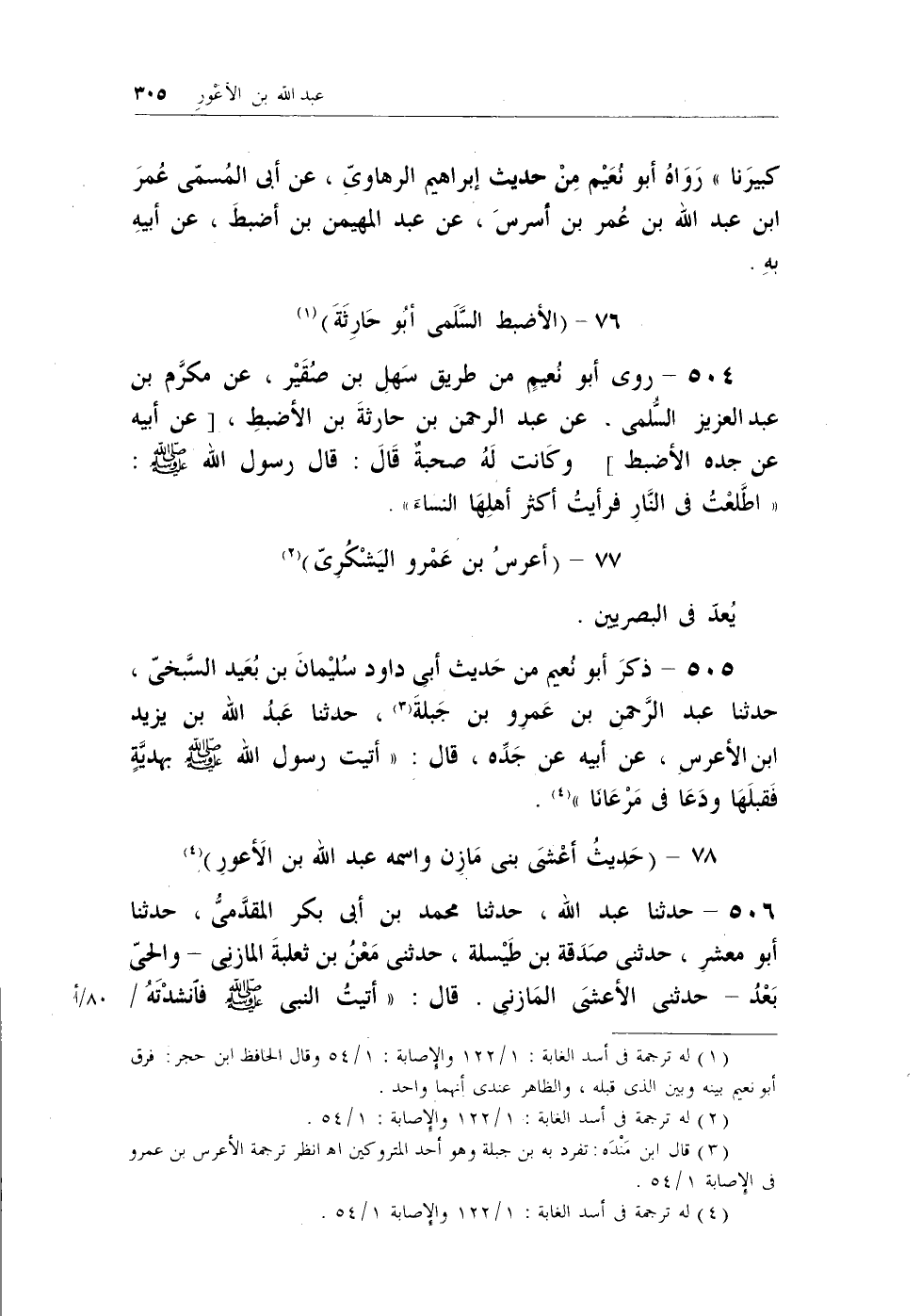 504 - روى أبو نُعيم من طريق سهل بن صُقير، عن مكرم بن عبد العزيز السُّلمي، عن عبد الرحمن بن حارثة بن الأضبط، [عن أبيه عن جده الأضبط] وكانت لهُ صحبةٌ قال: قال رسول الله - صلى الله عليه وسلم -: (اطَّلعْتُ في النار فرأيتُ أكثر أهلها النساء) .