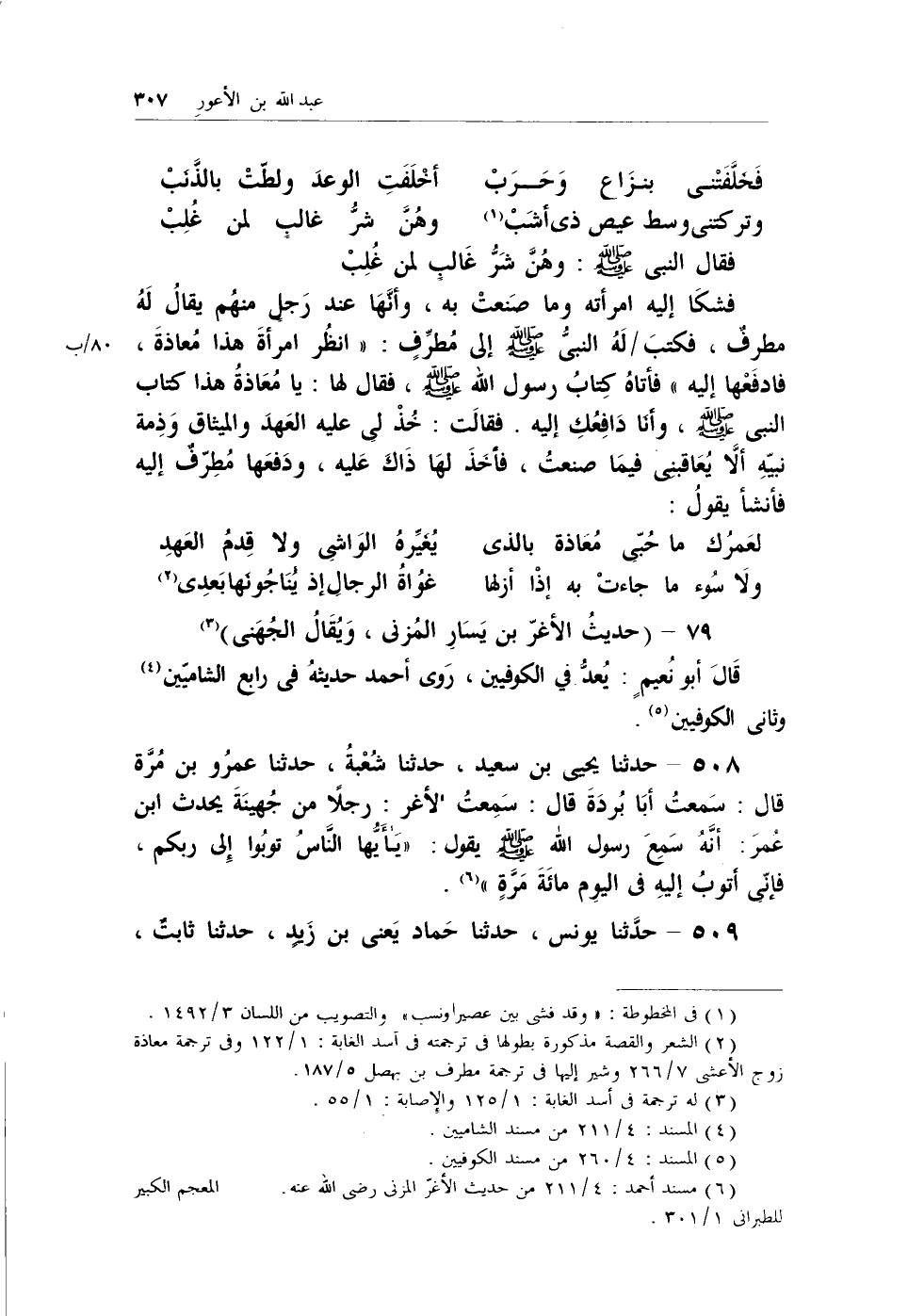 (¬2) الشعر والقصة مذكورة بطولها في ترجمة أسد الغابة: 1/122 وفي ترجمة معاذة زوج الأعشى 7/266 وشير إليها في ترجمة مطرف بن بهصل 5/187.