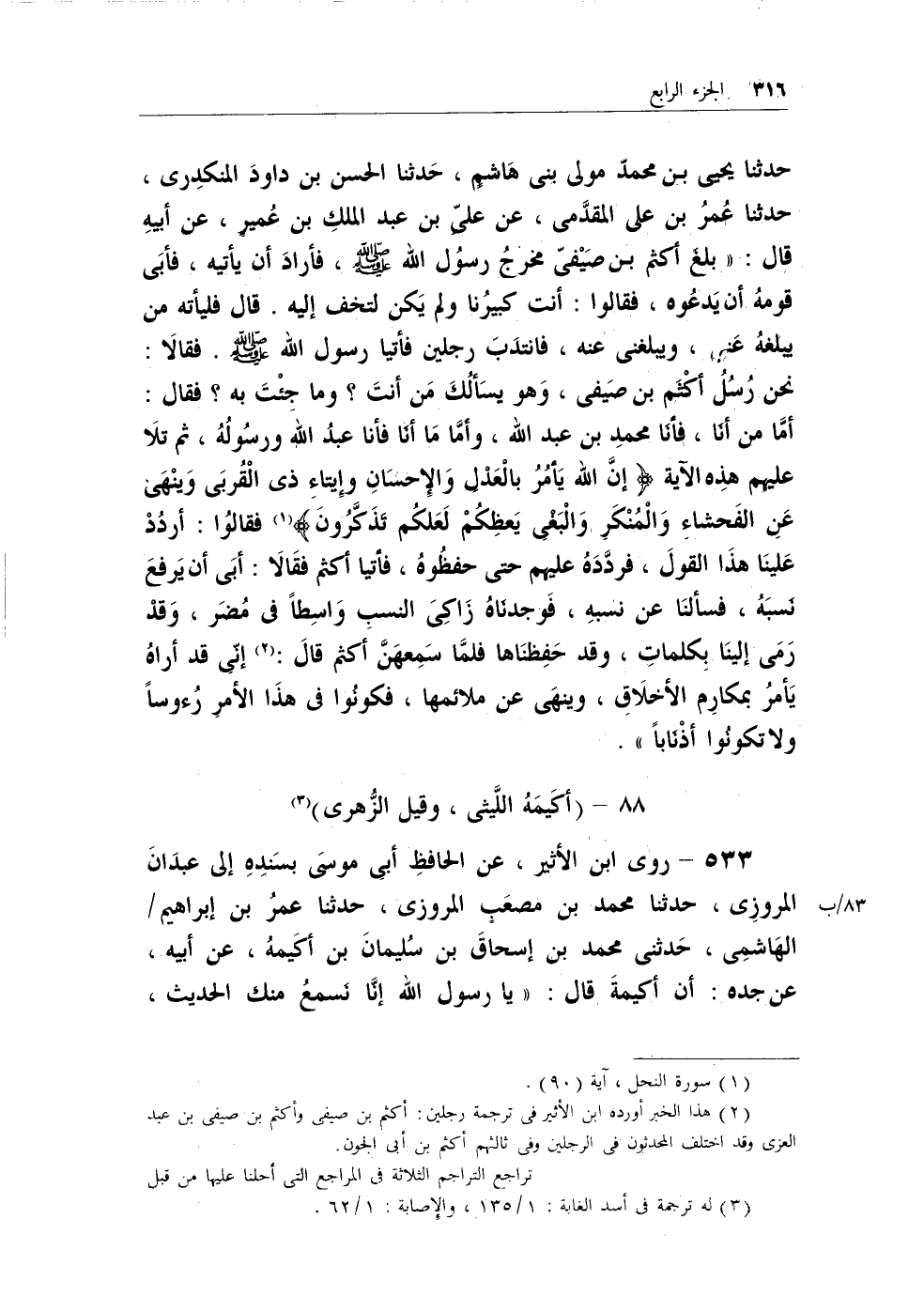 (¬2) هذا الخبر أورده ابن الأثير في ترجمة رجلين: أكثم بن صيفي وأكثم بن صيفي بن عبد العزي وقد اختلف المحدثون في الرجلين وفي ثالثهم أكثم بن أبي الجون. تراجع التراجم الثلاثة في المراجع التي أحلنا عليها من قبل.