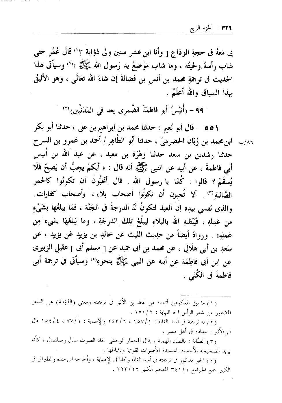 551 - قال أبو نُعيم: حدثنا محمد بن إبراهيم بن علي، حدثنا أبو بكر بن محمد بن زَبَّان الحضرمي، حدثنا أبو الطاهر/ أحمد بن عمرو بن السرح حدثنا رشدين بن سعد حدثنا زهرة بن معبد، عن عبد الله بن أُنيس أبي فاطمة، عن أبيه عن
