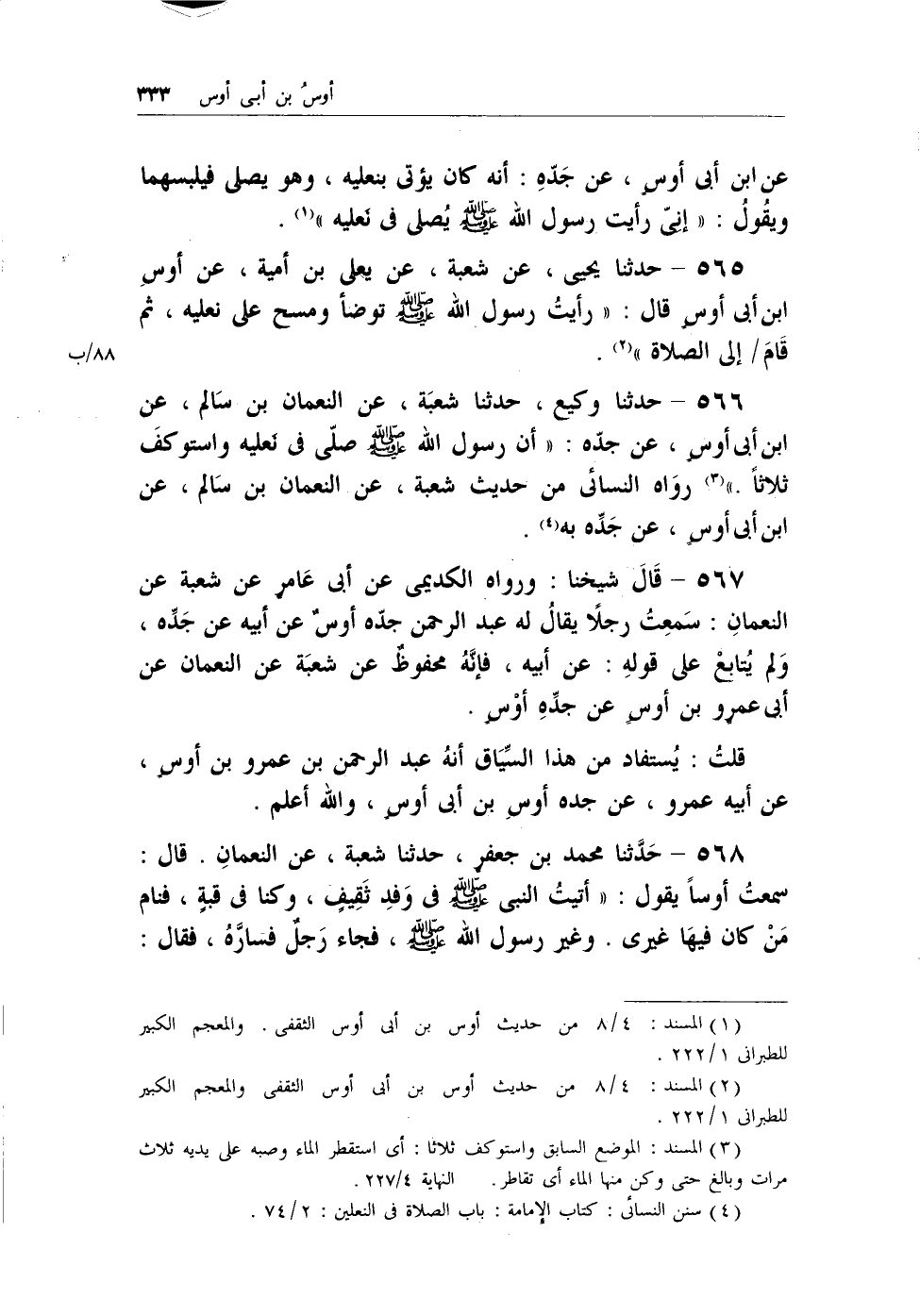 565 - حدثنا يحيى، عن شعبة، عن يعلى بن أمية، عن أوس بن أبي أوسٍ قال: (رأيتُ رسول الله - صلى الله عليه وسلم - توضأ ومسح على نعليه، ثم قام/ إلى الصلاة) (¬1) .