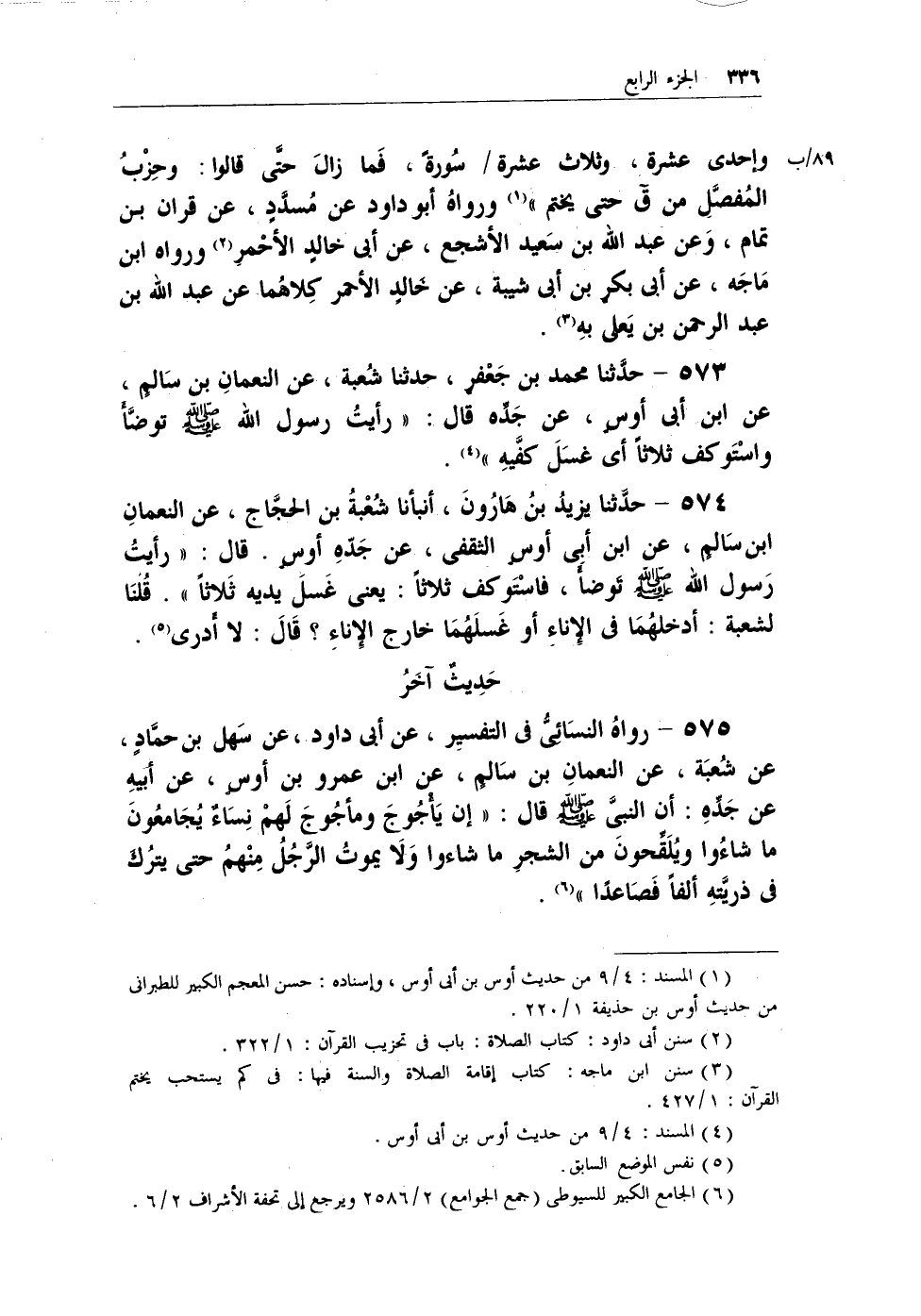 574 - حدثنا يزيدُ بنُ هارون، أنبأنا شُعبةُ بن الحجاج، عن النعمان بن سالمٍ، عن ابن أبي أوسٍ الثقفي، عن جده أوسٍ. قال: (رأيتُ رسول الله - صلى الله عليه وسلم - توضأ، فاستوكف ثلاثاً: يعني غسل يديه ثلاثاً) . قلنا لشعبة: أدخلهُما في الإناء أو غسلهُما