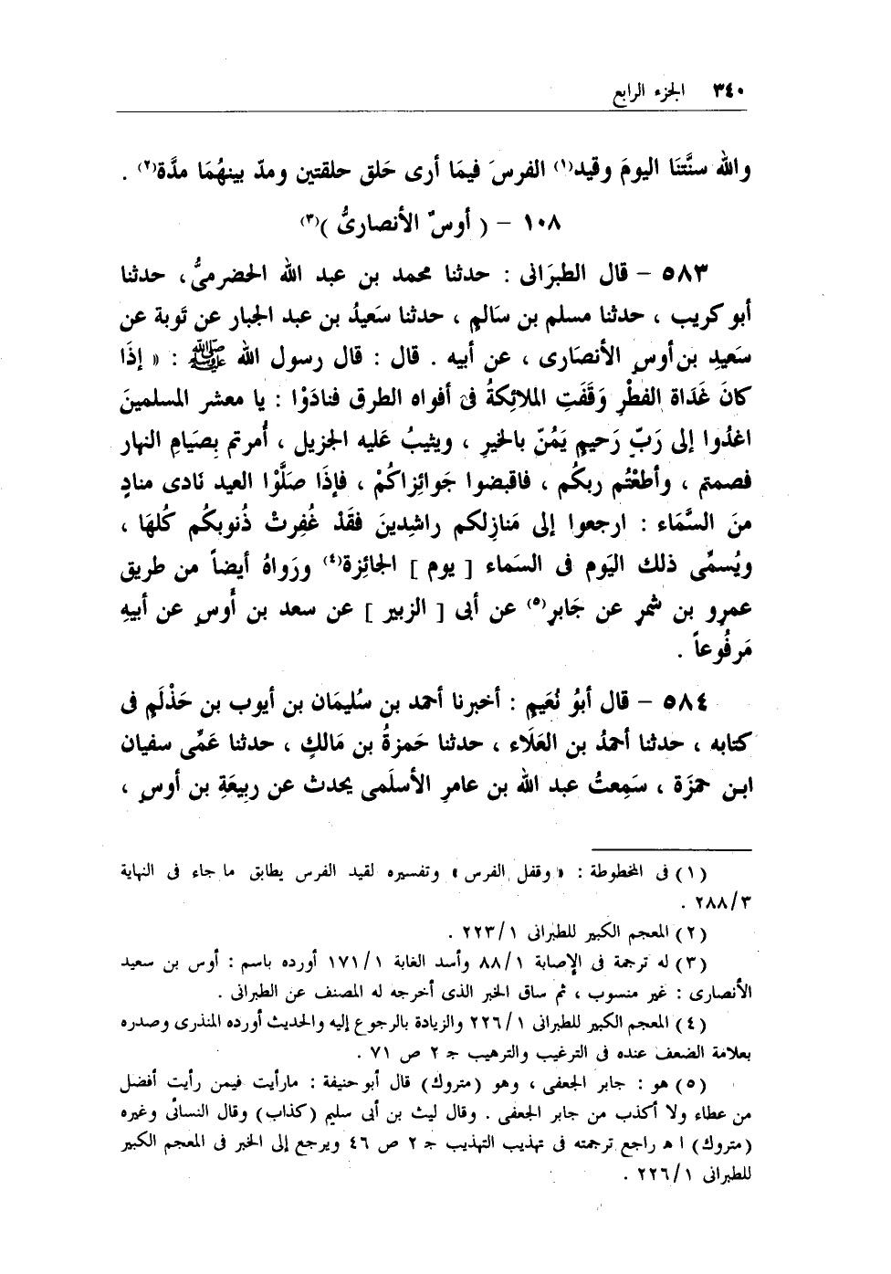 583 - قال الطبراني: حدثنا محمد بن عبد الله الحضرمي، حدثنا أبو كريب، حدثنا مسلم بن سالم، حدثنا سعيدُ بن عبد الجبار عن توبة عن سعيد بن أوسٍ الأنصاري، عن أبيه. قال: قال رسول الله - صلى الله عليه وسلم -: (إذا كان غداة الفطرِ وقفت الملائكةُ في أفواه الطرق فنادوا: يامعشر المسلمين أغدُوا إلى ربٍ رحيمٍ يمنّ بالخير، ويثيبُ عليه الجزيل، أُمرتم بصيام النهار فصمتم، وأطعْتُم ربكُم، فاقبضوا جوائزاكُمْ، فإذا صلوا العيد نادى منادٍ من السماء: ارجعوا إلى منازلكم راشدين فقدْ غُفِرتْ ذنُوبكُم كلها، ويُسمى ذلك اليوم في السماء [يوم] الجائزة (¬2) ورواهُ أيضاً من طريق عمرو بن شمرٍ عن جابرٍ (¬3) عن أبي [الزبير] عن سعد بن أوسٍ عن أبيه مرفوعاً.