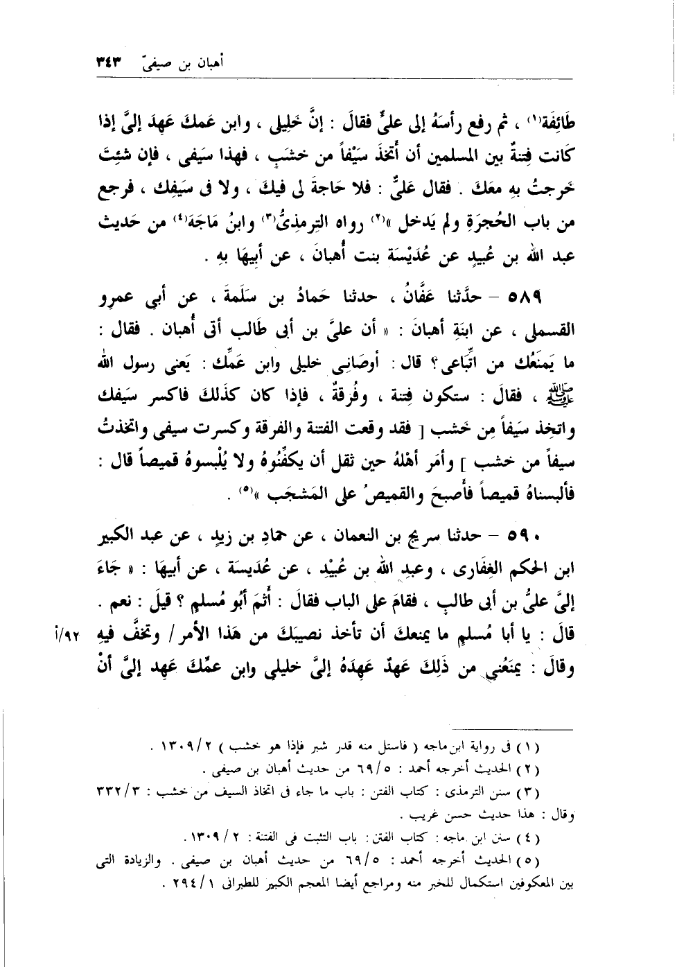 طائفة (¬1) ، ثم رفع رأسهُ إلى عليٍّ فقال: إن خليلي، وابن عمك عهد إليَّ إذا كانت فتنةٌ بين المسلمين أن أتخذ سيفاً من خشبٍ، فهذا سيفي، فإن شئت خرجتُ به معك. فقال عليٌّ: فلا حاجة لي فيك، ولا في سيفك، فرجع من باب الحُجرة ولم يدخل) (¬2) رواه الترمذي (¬3) وابنُ ماجه (¬4) من حديث عبد الله بن عُبيدٍ عن عُديسة بنت أهبان، عن أبيها به.
