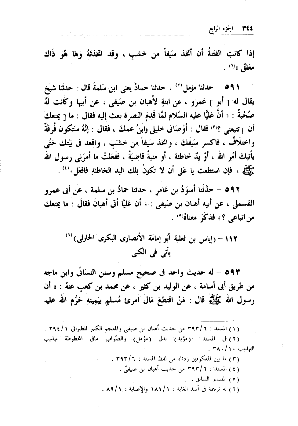 592 - حدثنا أسودُ بن عامرٍ، حدثنا حمادُ بن سلمة، عن أبي عمرو القسملي، عن أبيه أهبان بن صيفي: (أن علياً أتى أهبان فقال: ما يمنعك من اتباعي؟) فذكر معناهُ (¬4) .